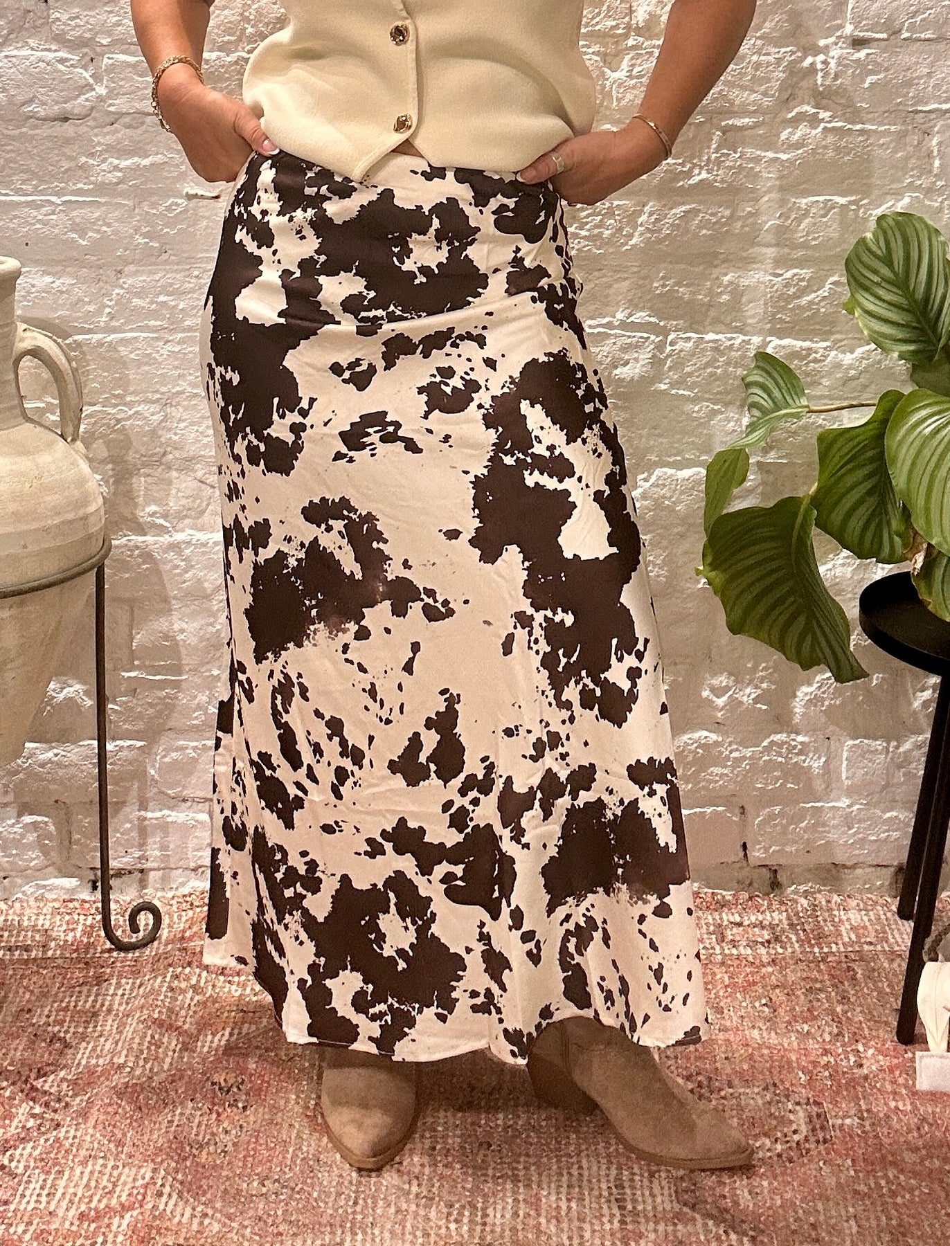 The Cow Hide Satin Smooth Long Pencil skirt. Has a stretchy waist with a zip fastener.