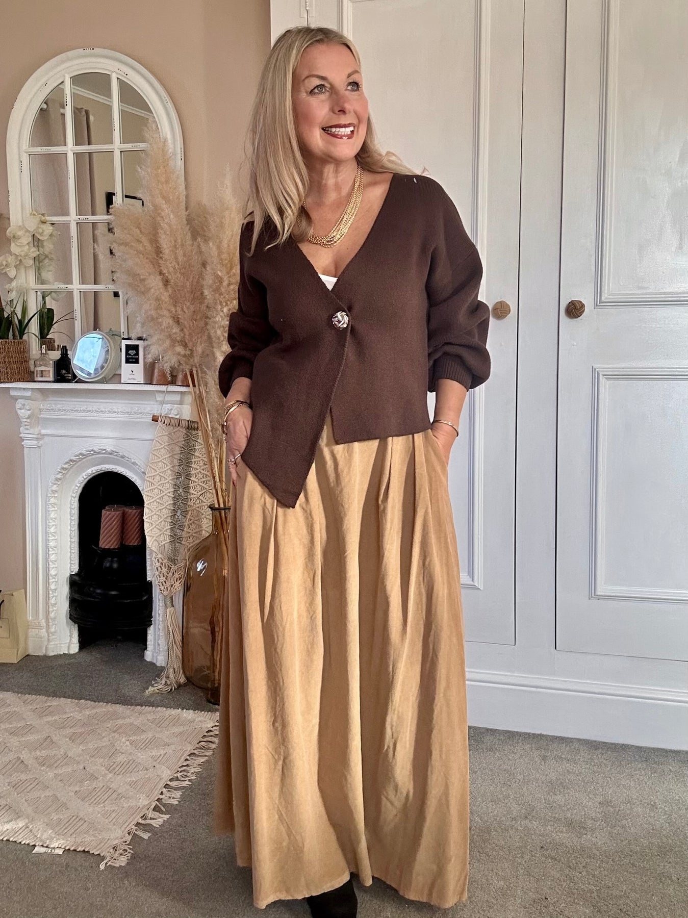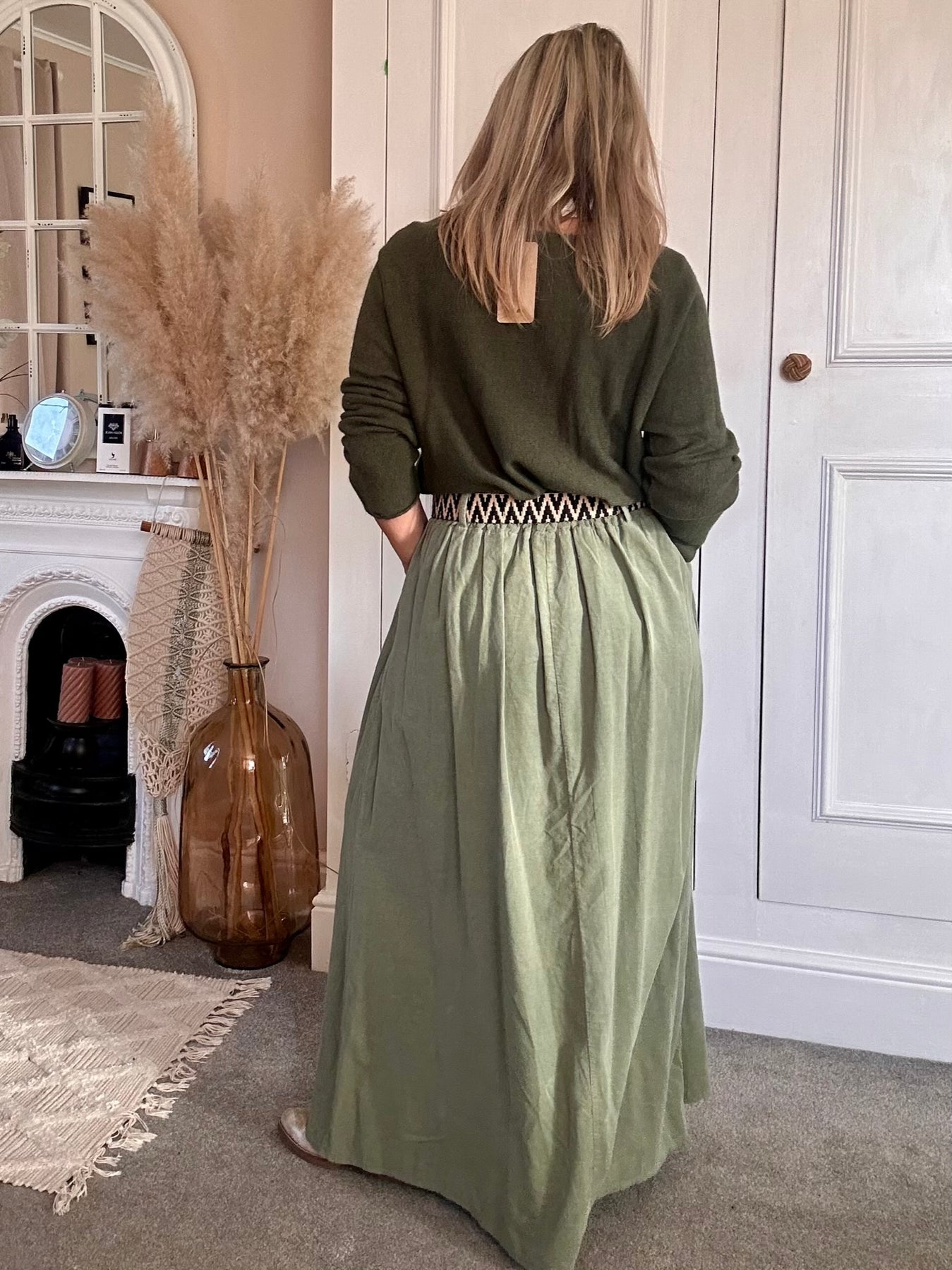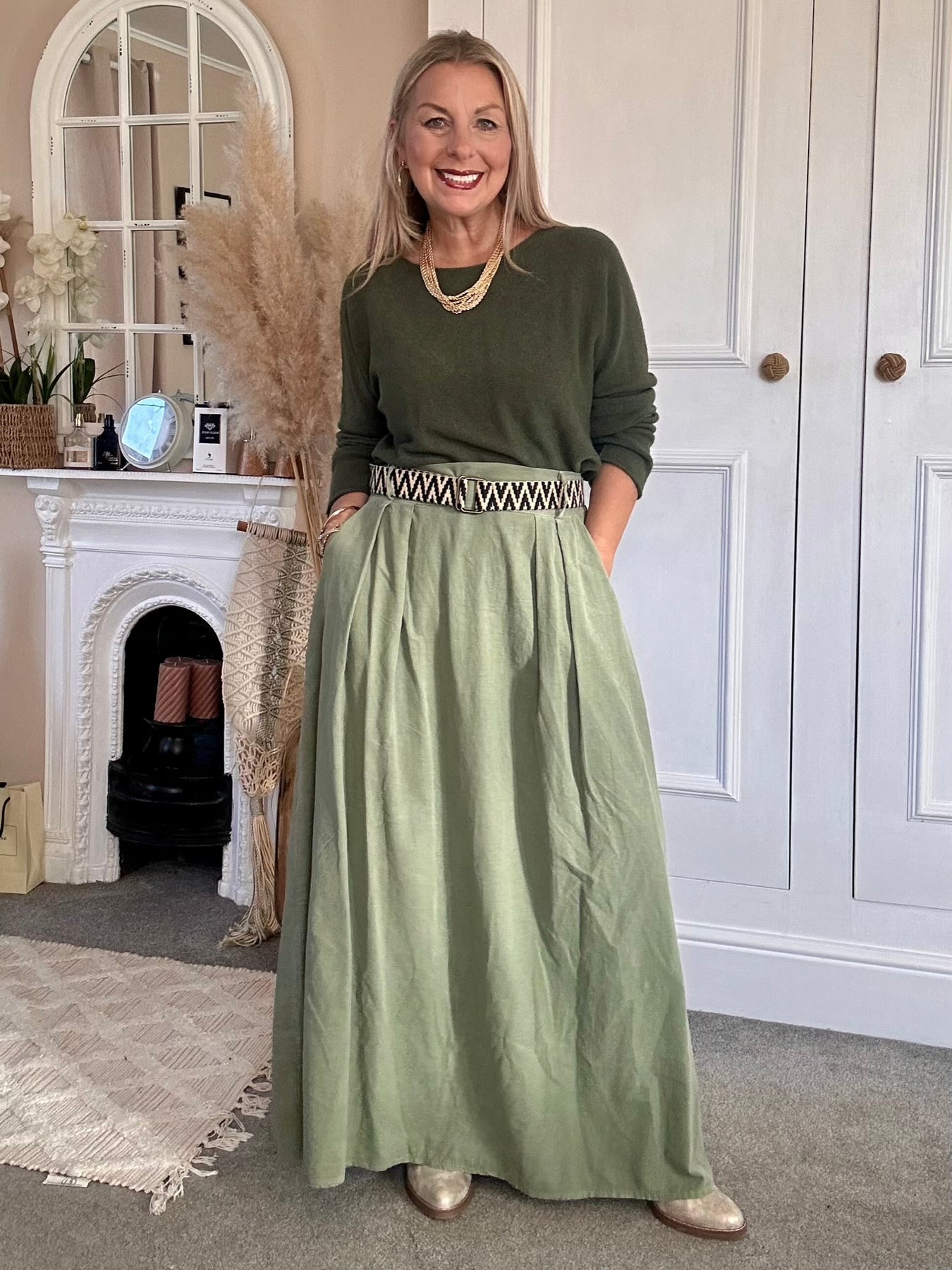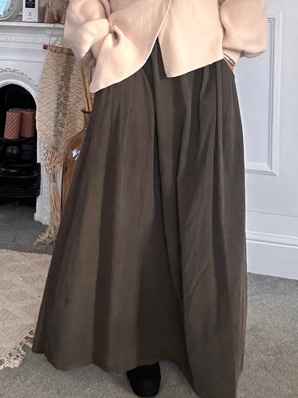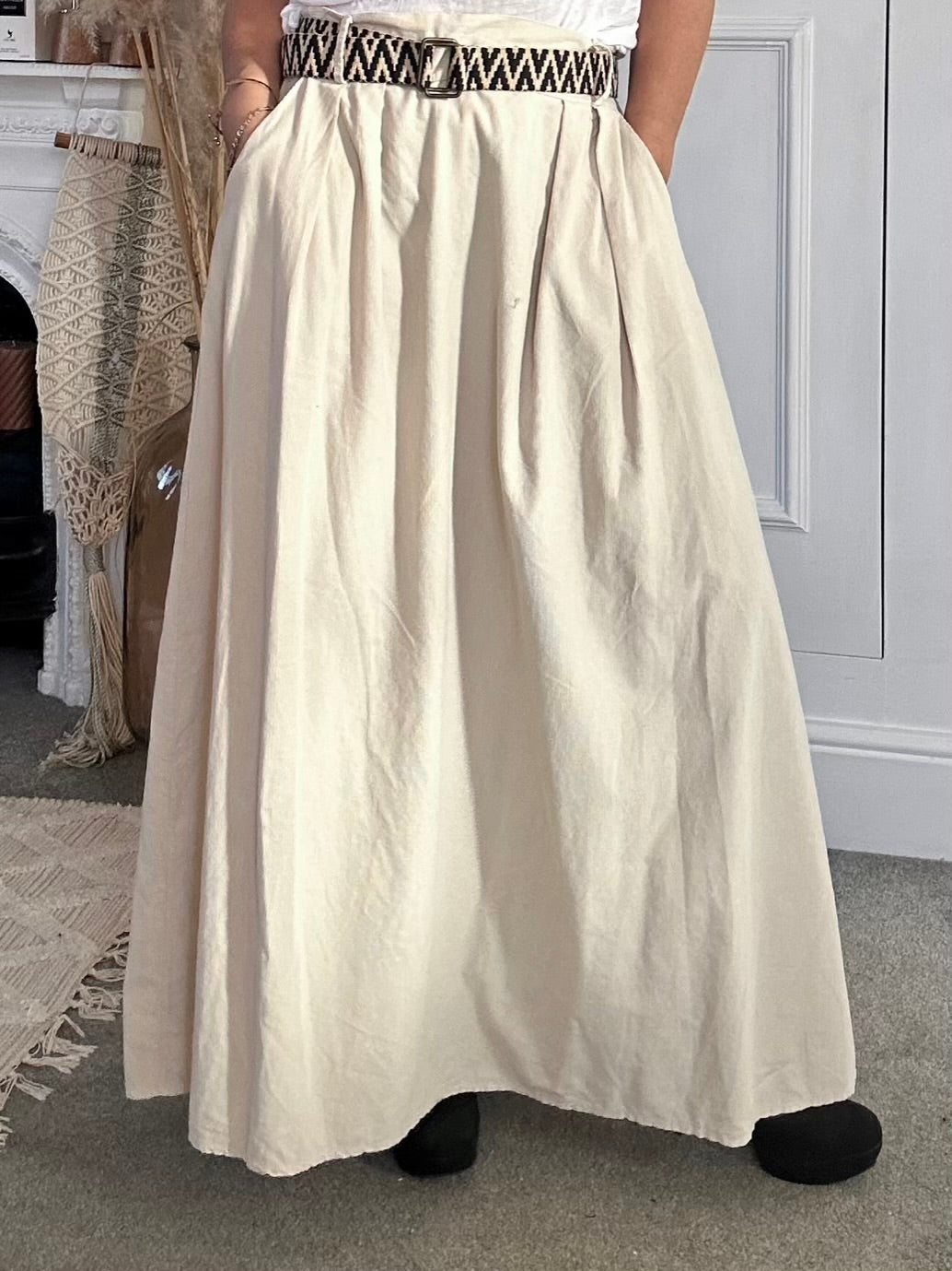 The PinCord Relaxed Will Long Maxi Skirt With Belt And Pockets. A full, softly structured skirt in fine needle cord. Effortlessly wearable with a high-waist fit, deep pockets, and an artisan edge a piece that moves beautifully from everyday ease to evening warmth. Pinch pleat front with elastic back for comfort