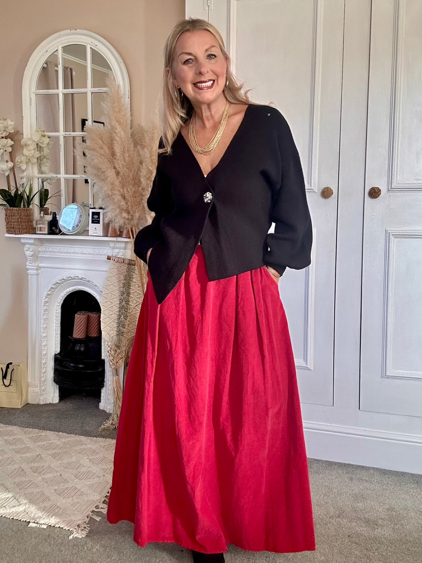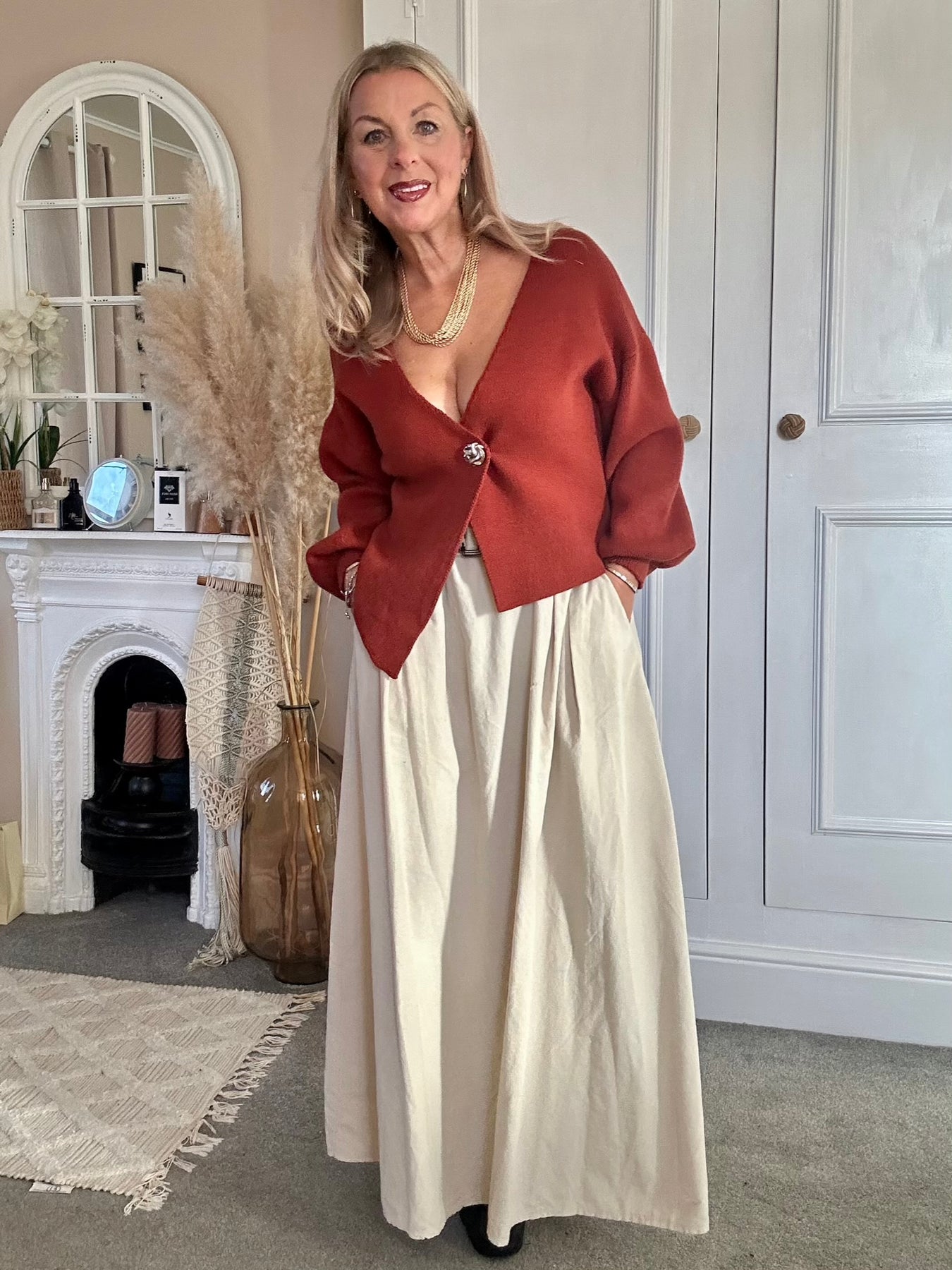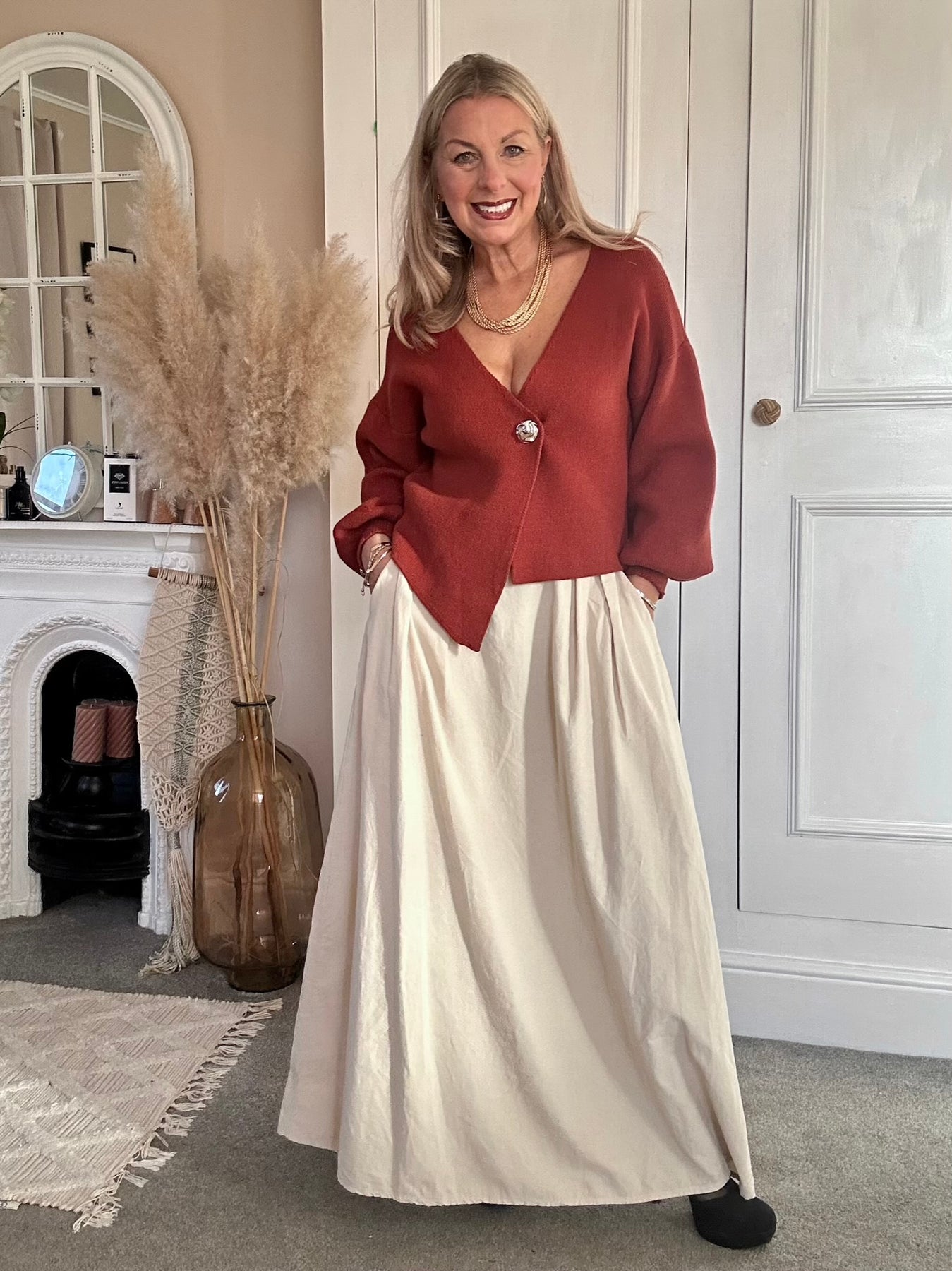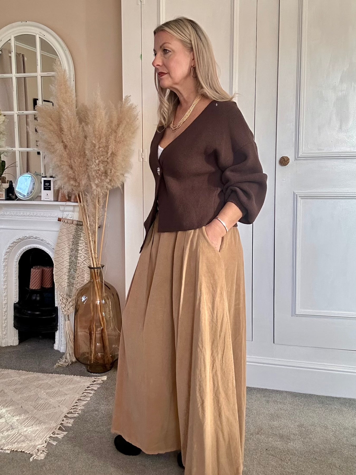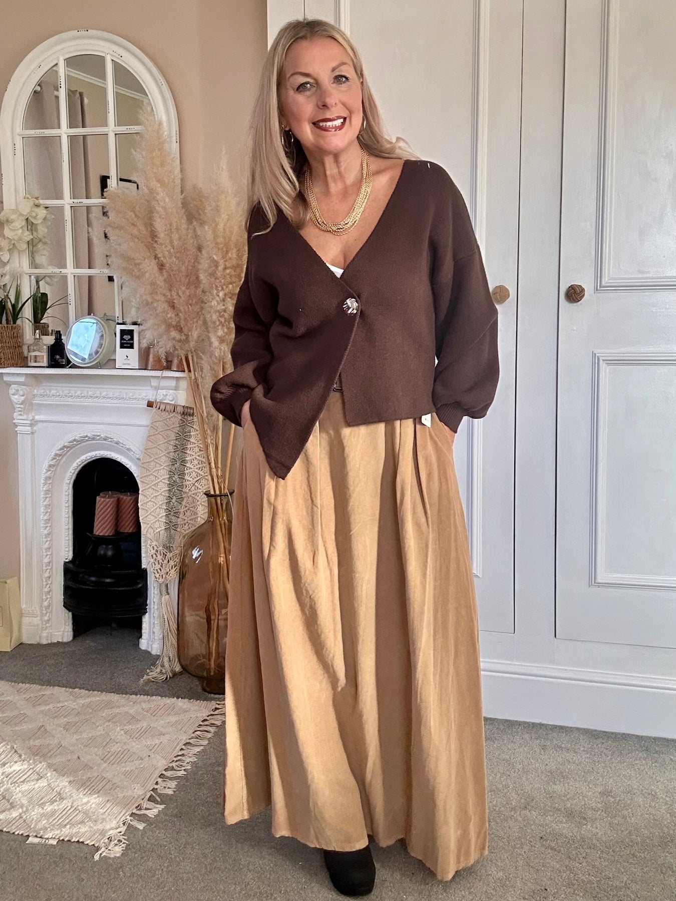The PinCord Relaxed Will Long Maxi Skirt With Belt And Pockets. A full, softly structured skirt in fine needle cord. Effortlessly wearable with a high-waist fit, deep pockets, and an artisan edge a piece that moves beautifully from everyday ease to evening warmth. Pinch pleat front with elastic back for comfort