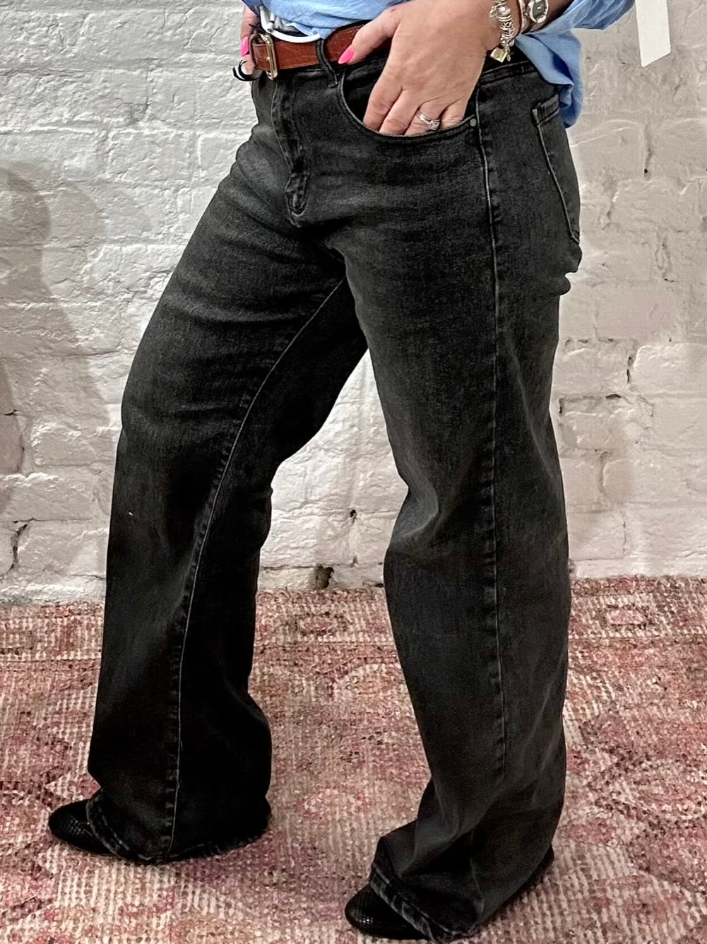Miss RJ Washed Black Fashion Wide Leg Jeans. Zip and button fastener front and back pockets. Super stretchy