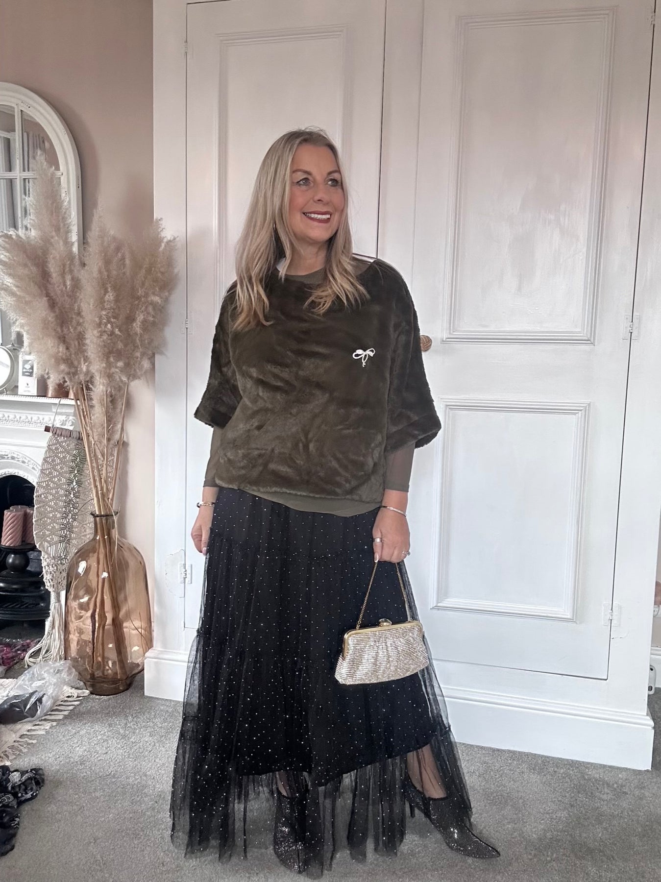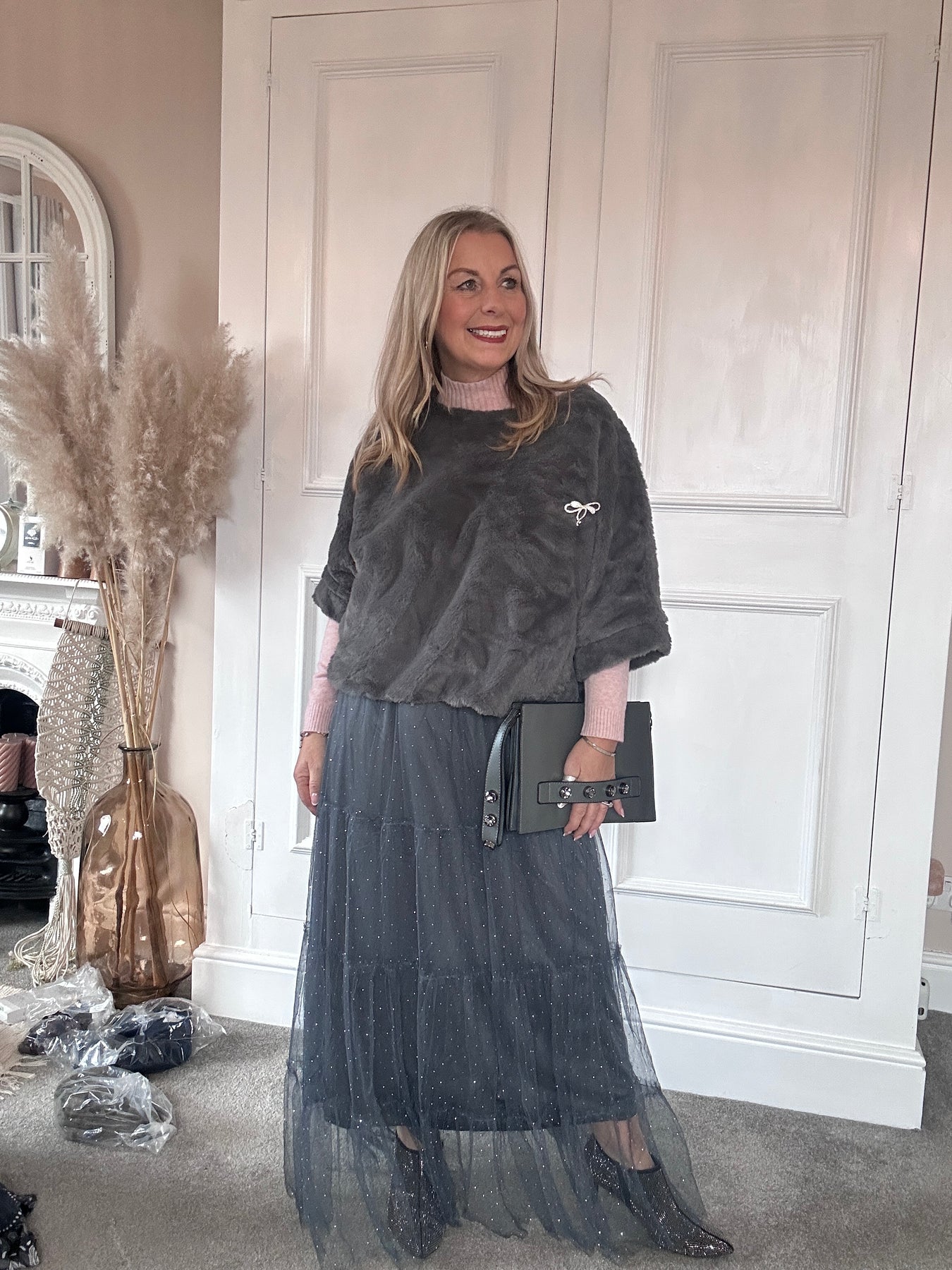 The Evening Charm Faux Fur Tank With Bow Broach.