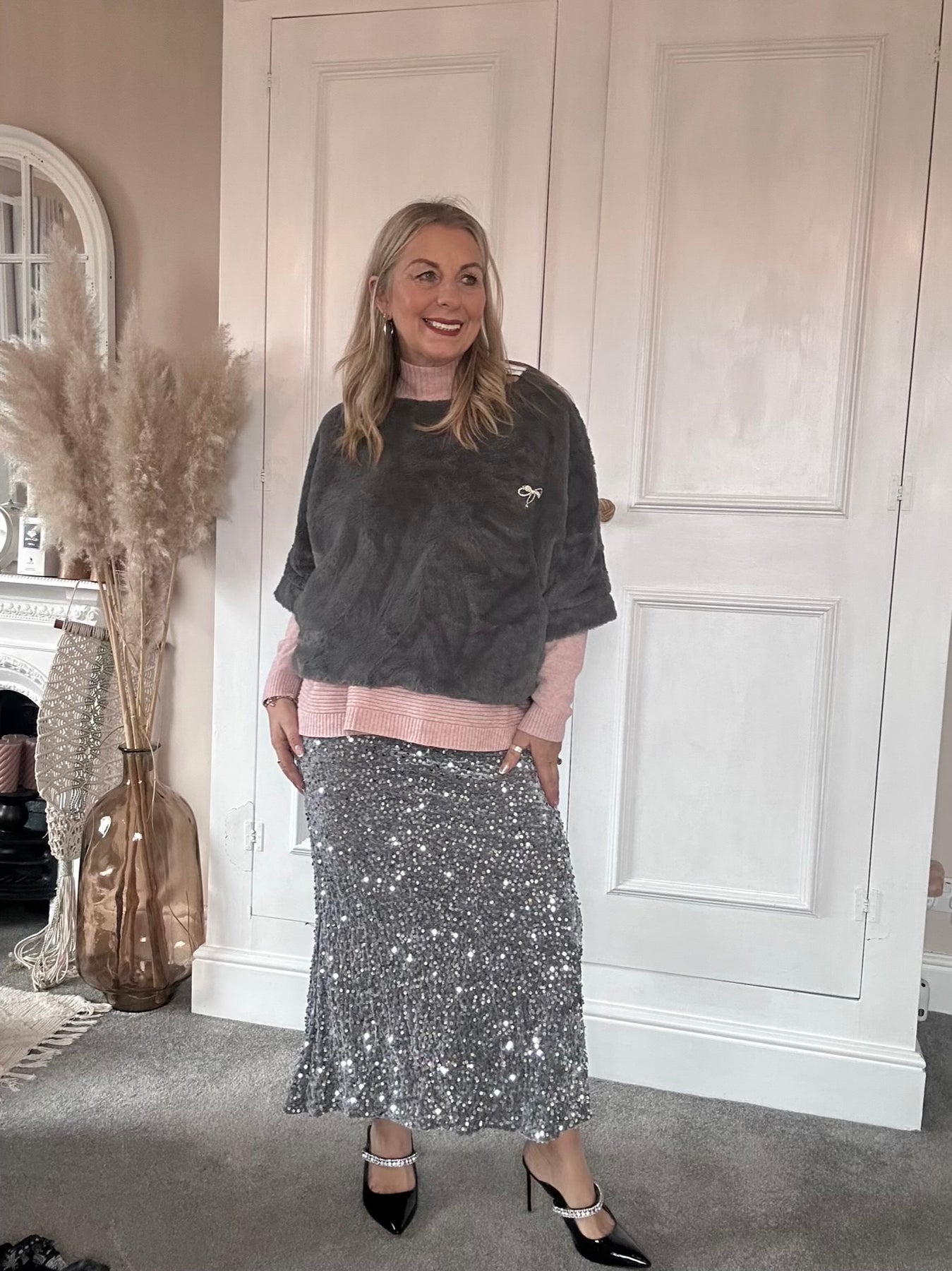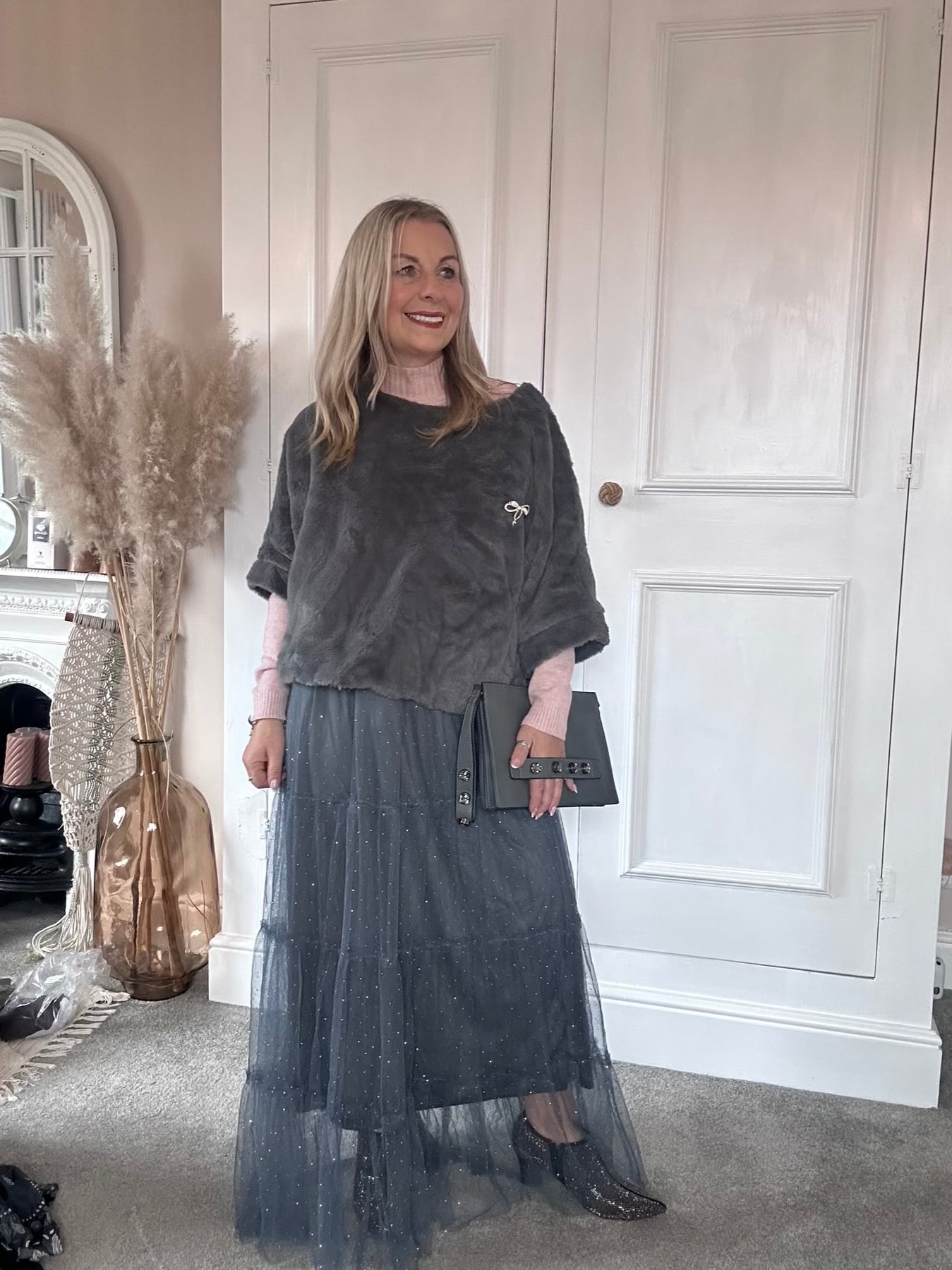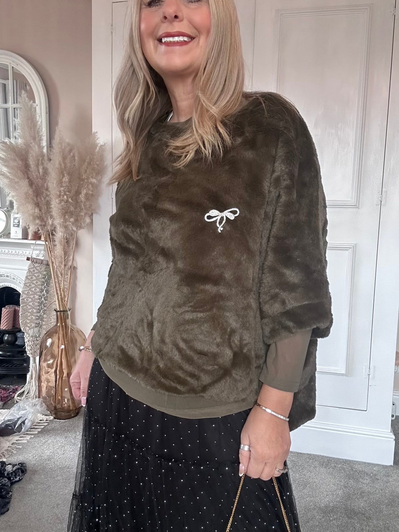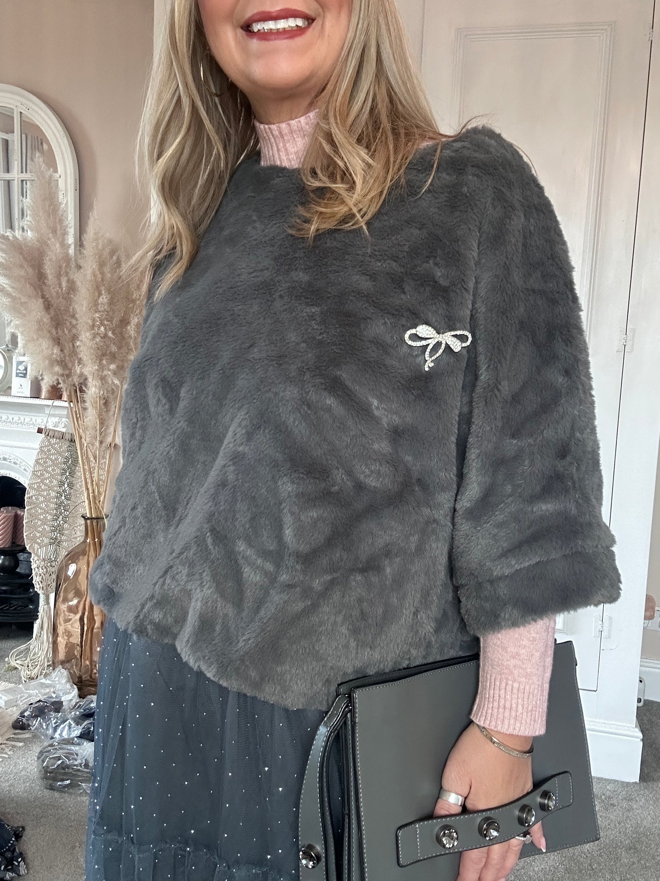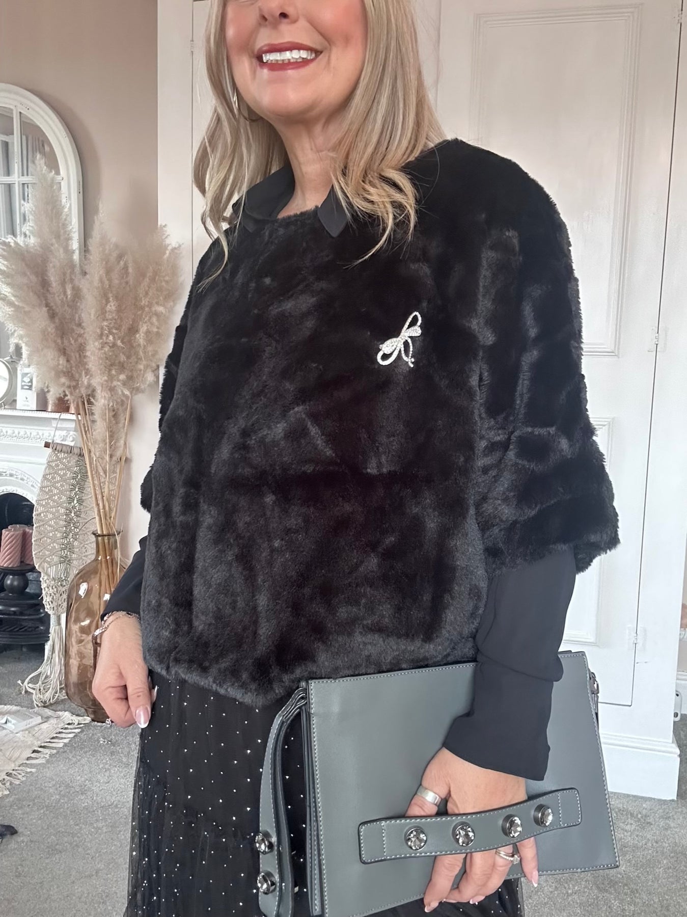 A beautifully soft faux-fur top designed in a chic, sculpted silhouette. Its boxy cut layers effortlessly over blouses or dresses, adding instant texture and sophistication. Finished with a delicate embellished emblem for a touch of refined sparkle.