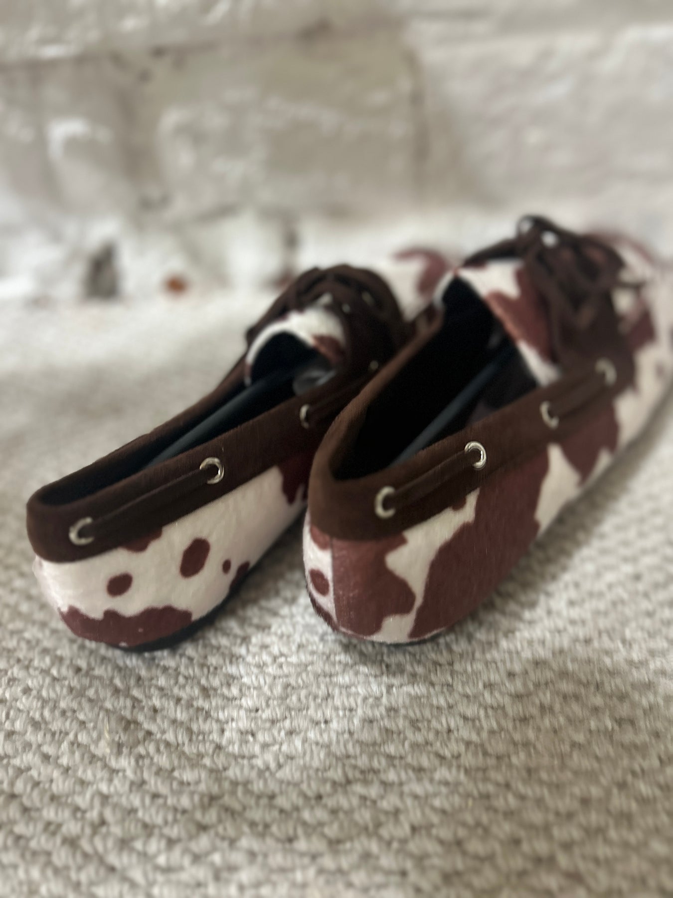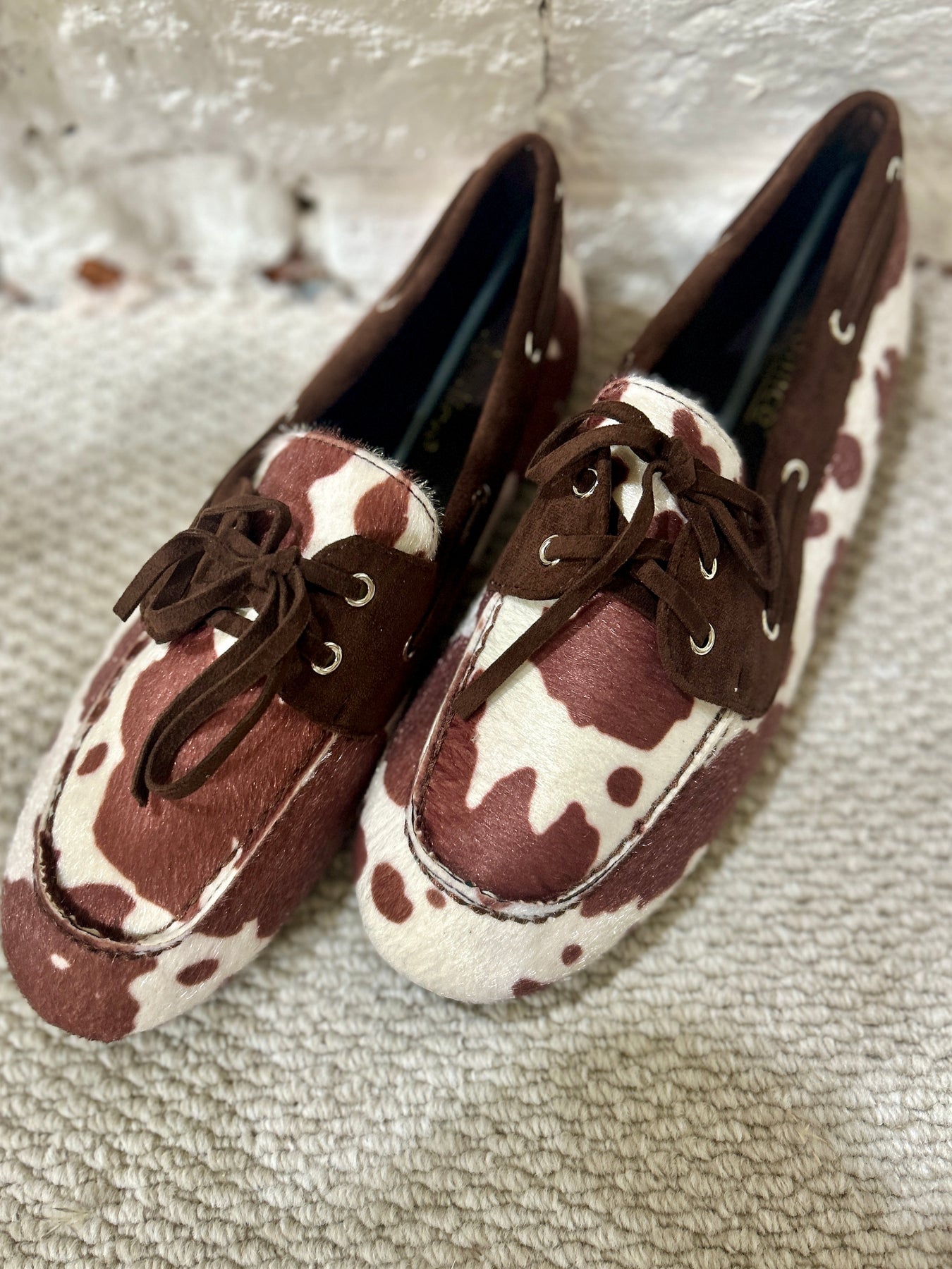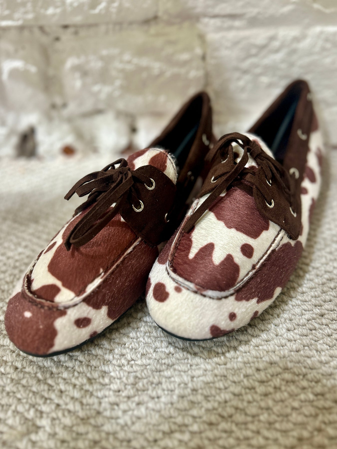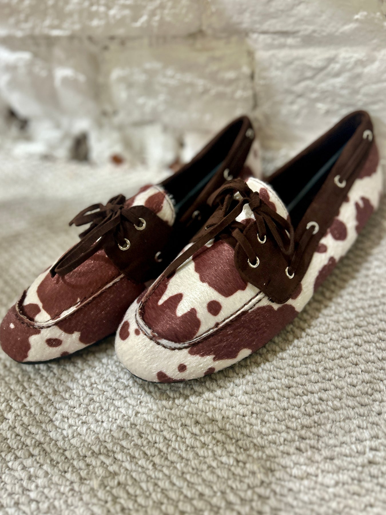 Cow Hide Pattern Flat Lofa Smart Shoe In Brown. Faux cow hide and suede with a lace up front. Made in Paris