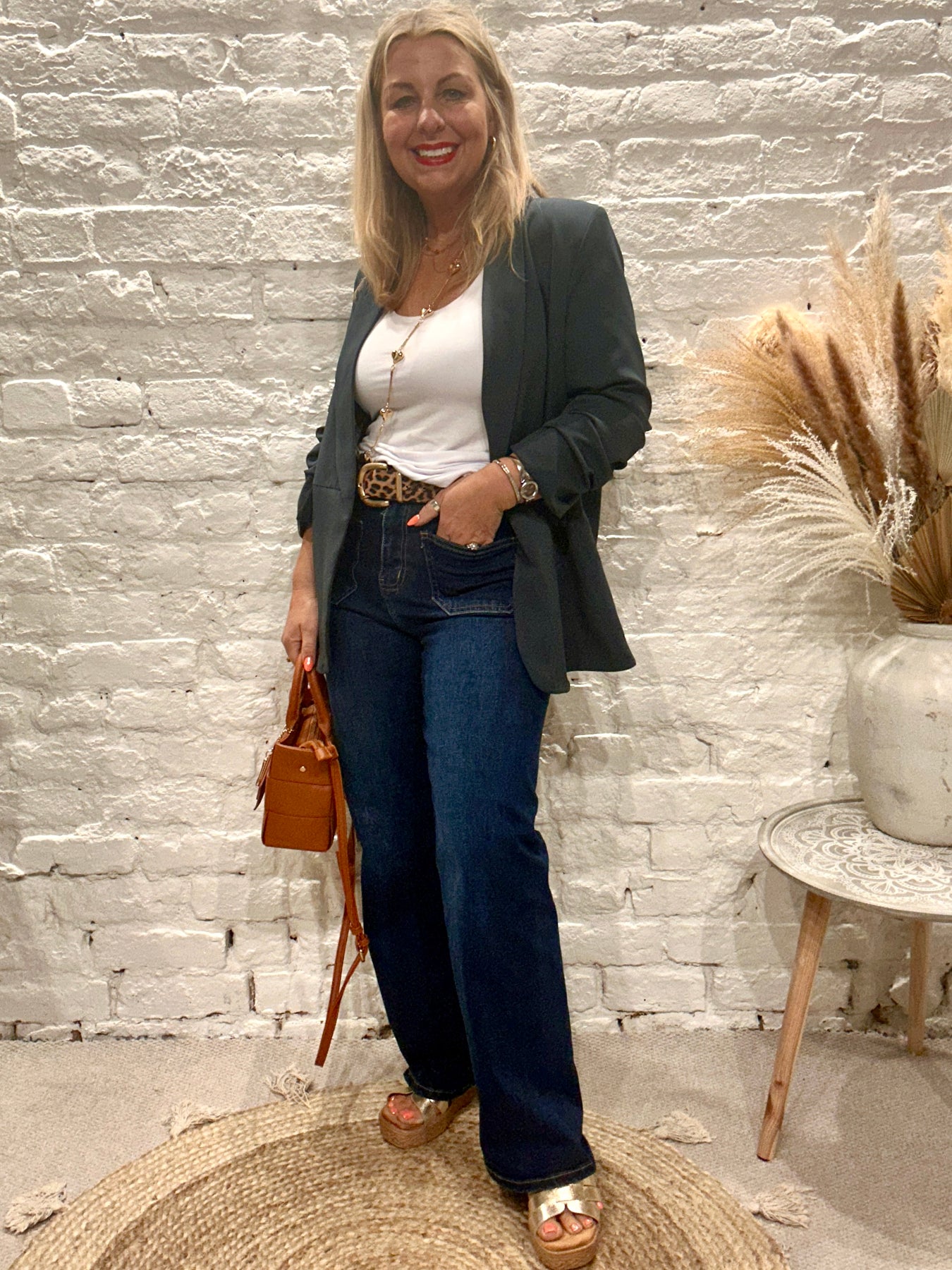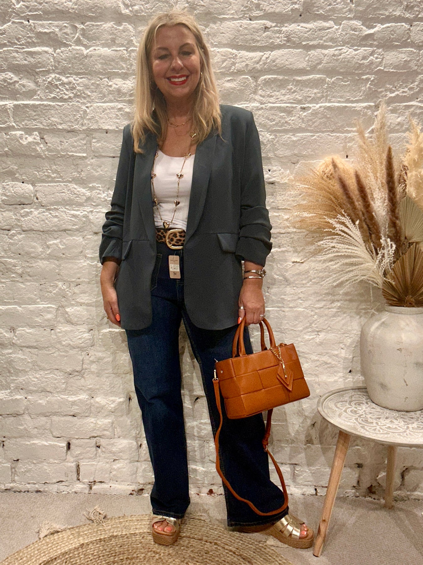 Nadine plain Single Breast Blazer Fully lined With Gathered Arms in navy petrol blue