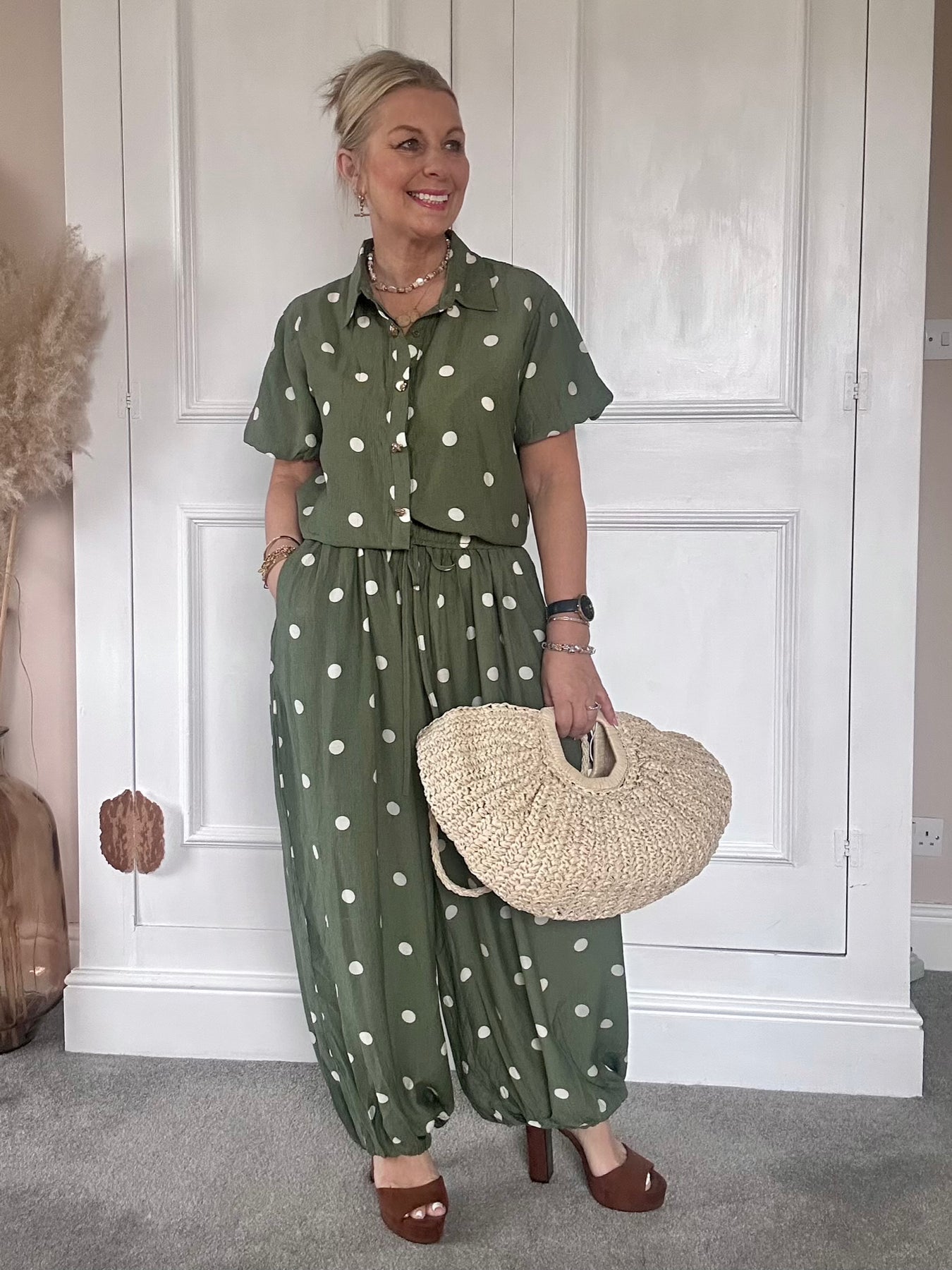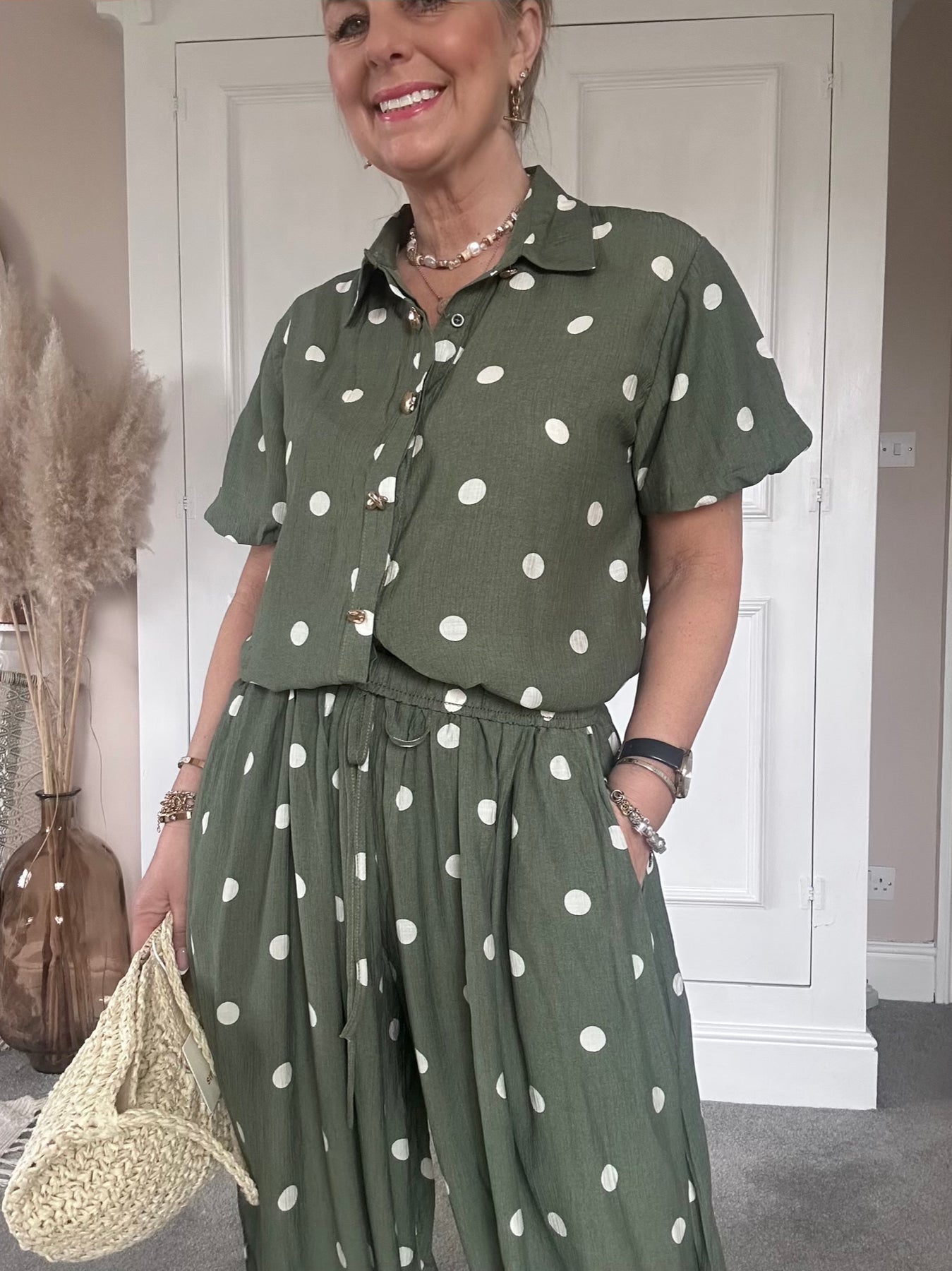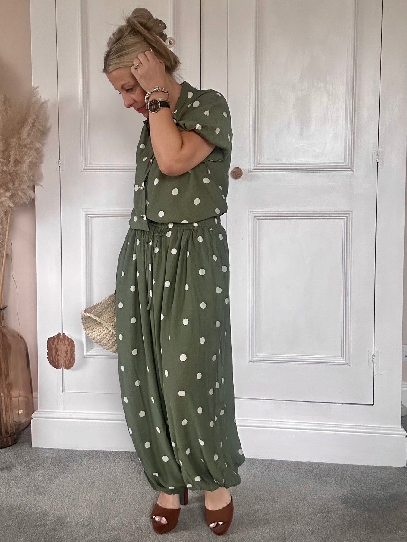 The Anne Polka Dot Co ord Set Top and Trousers in Moss Green