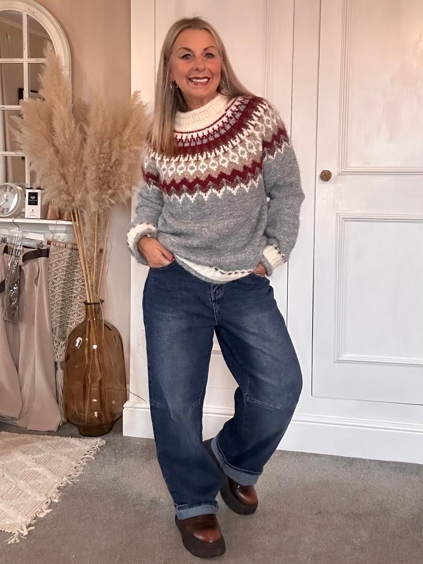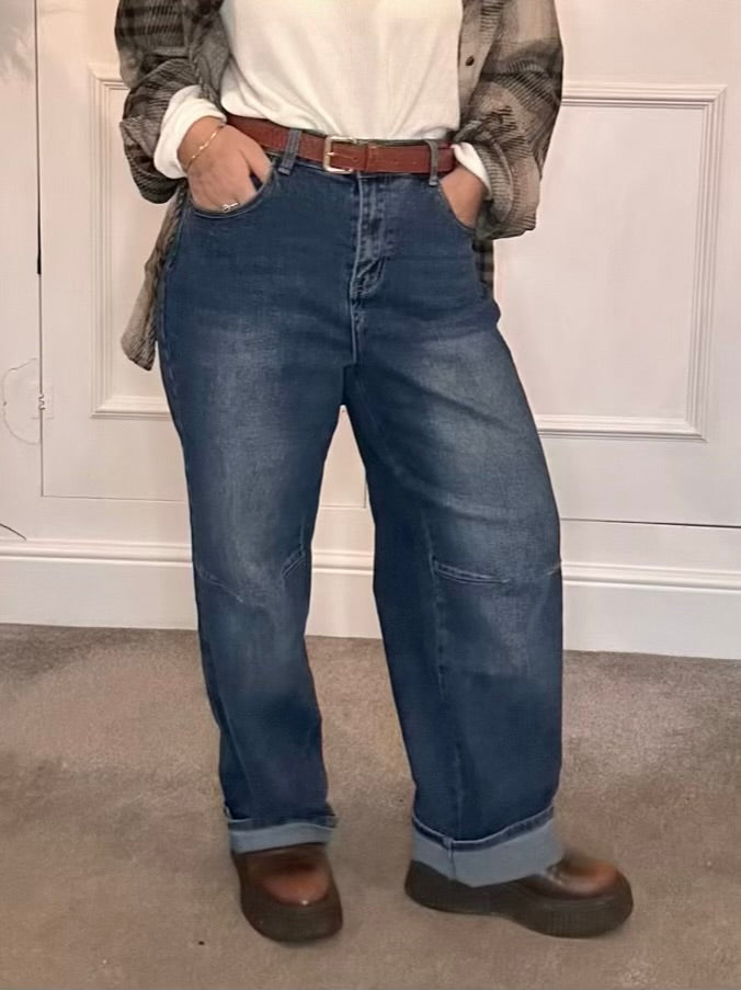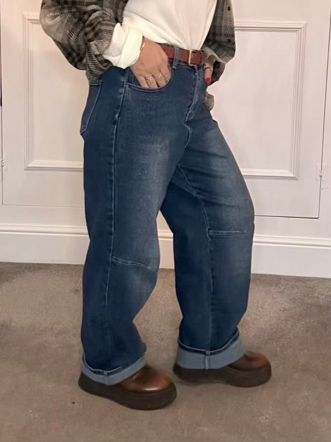 The Carpenters Red Berry Barrel Balloon Denim Jeans With Pockets.  A relaxed jean with subtle carpenter style tonal knee stitch seam detail at the knee. A wide leg shape barrel towards the bottom with a mid high rise fit. Turn up optional
