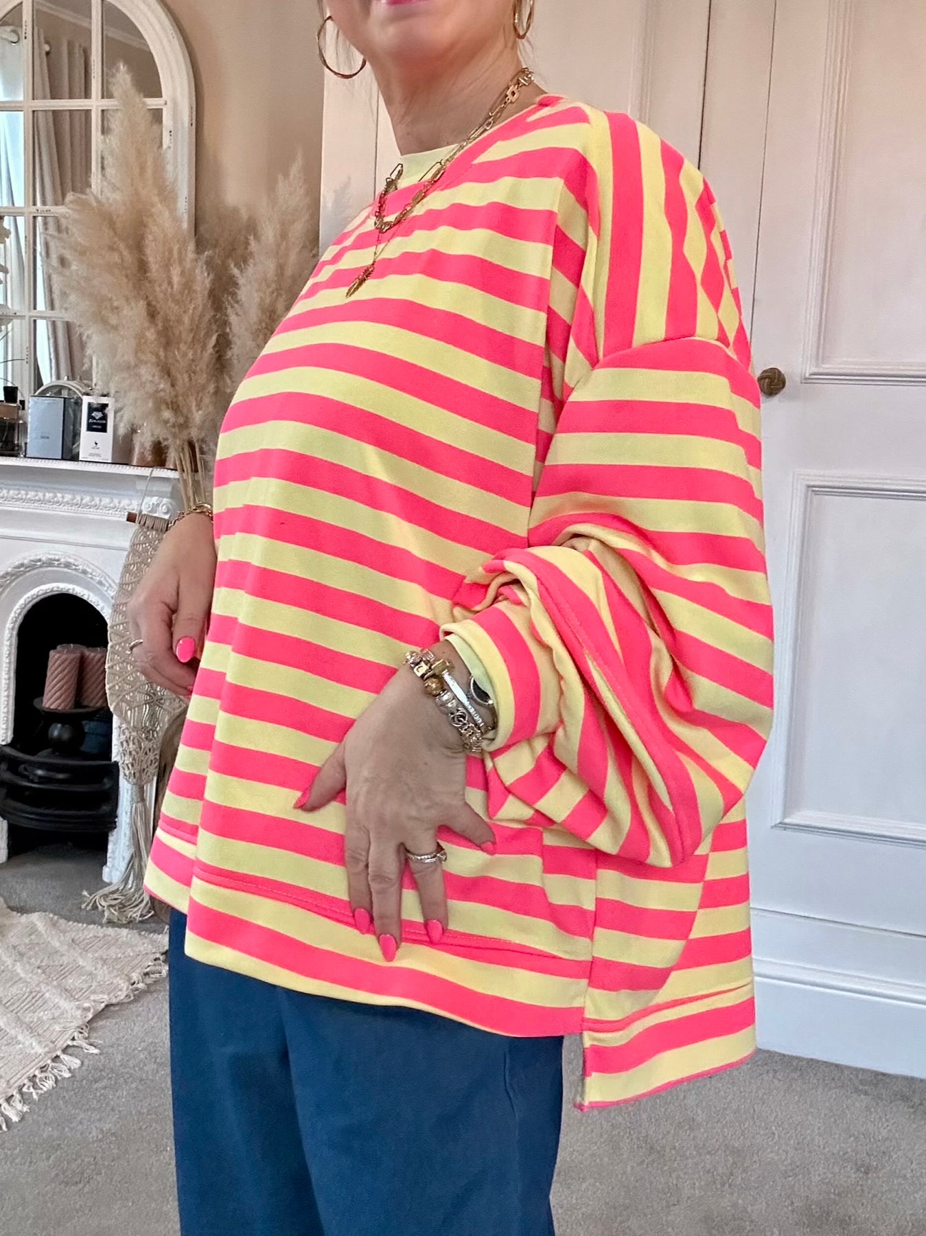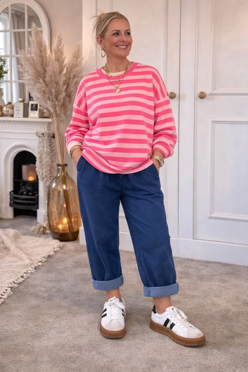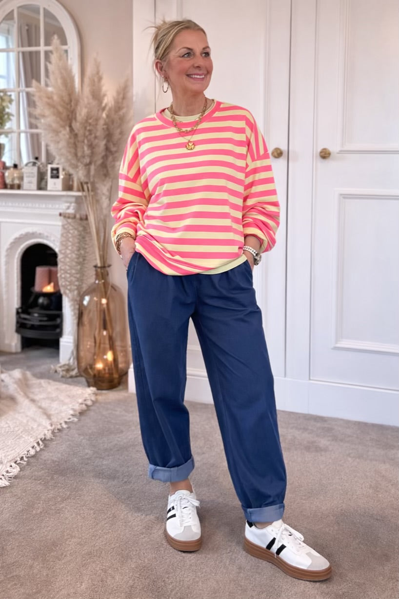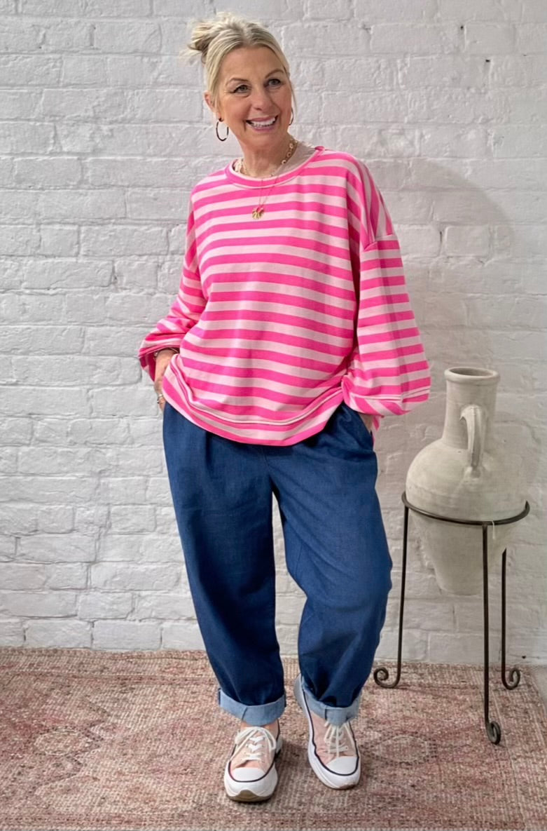 The Chelsea Candy Pop Stripe Ballon Arm Breton Stripe Sweet Top. Designed in a soft lightweight jersey with a relaxed oversized drape. Dropped shoulder, round neck and ballon sleeve design.