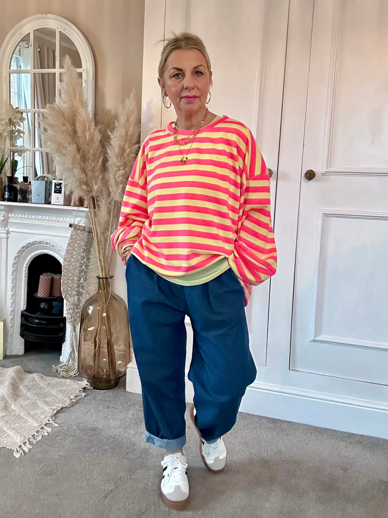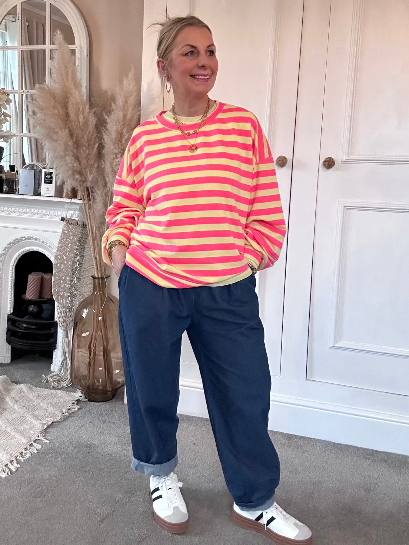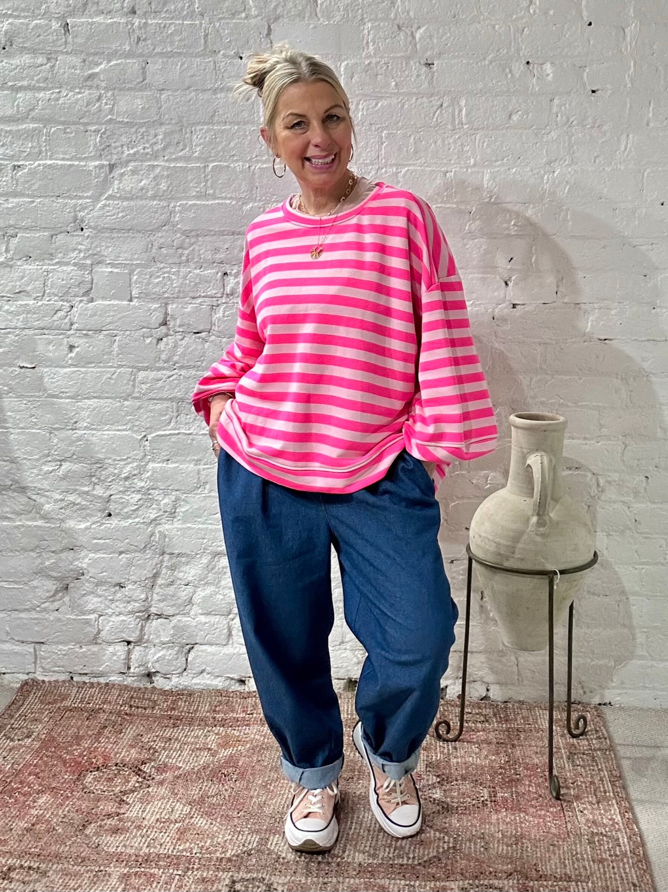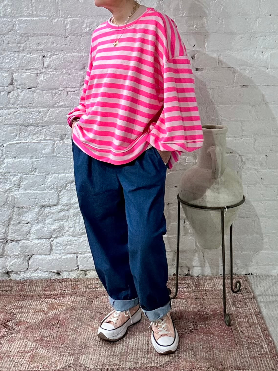 The Chelsea Candy Pop Stripe Ballon Arm Breton Stripe Sweet Top. Designed in a soft lightweight jersey with a relaxed oversized drape. Dropped shoulder, round neck and ballon sleeve design.