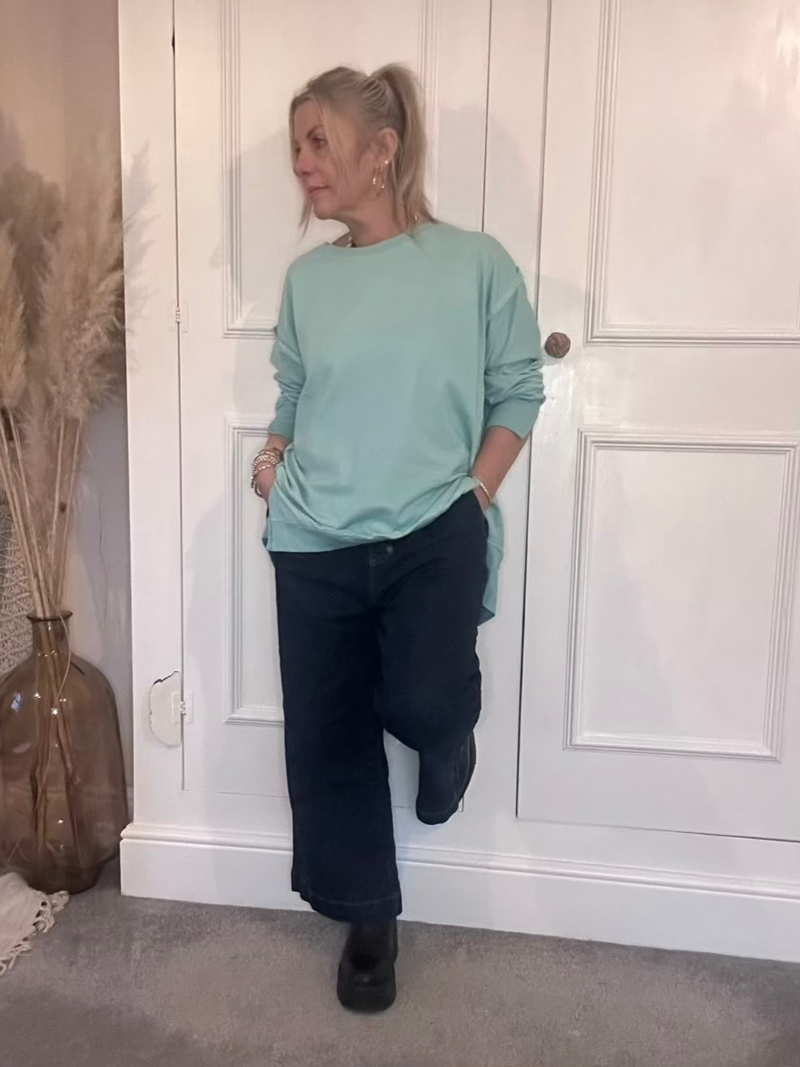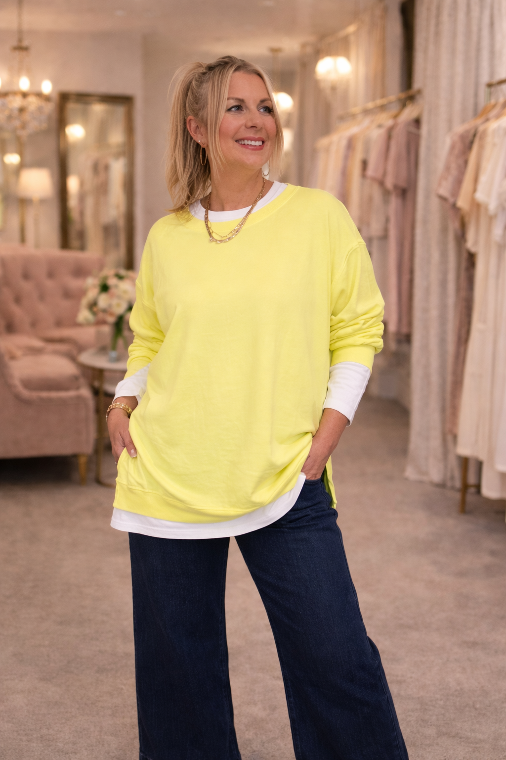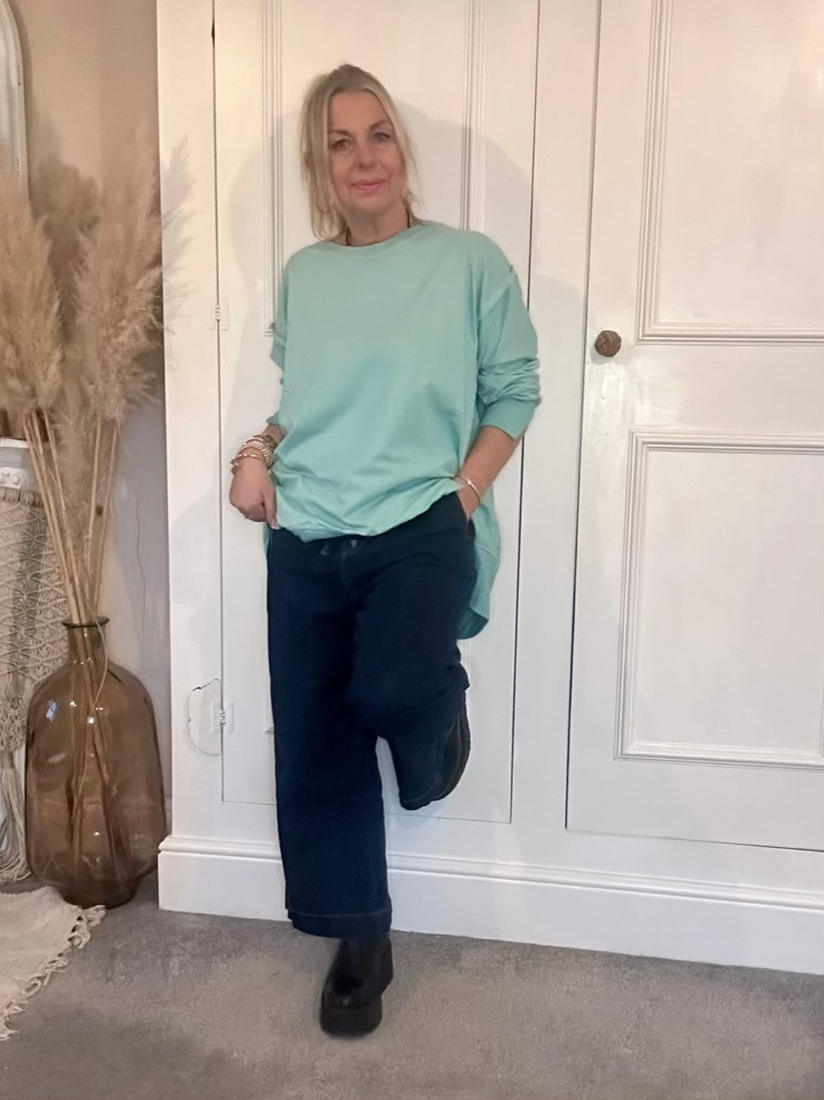 The Chelsea Plain Essential Sweat Top With Side Splits. Relaxed oversized sweat top in spring vibrant colours. Soft lightweight sweatshirt fabric, dropped shoulders round neck with long sleeves