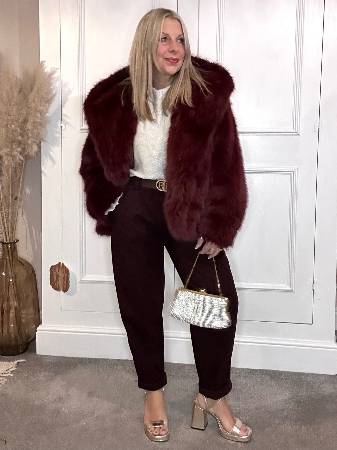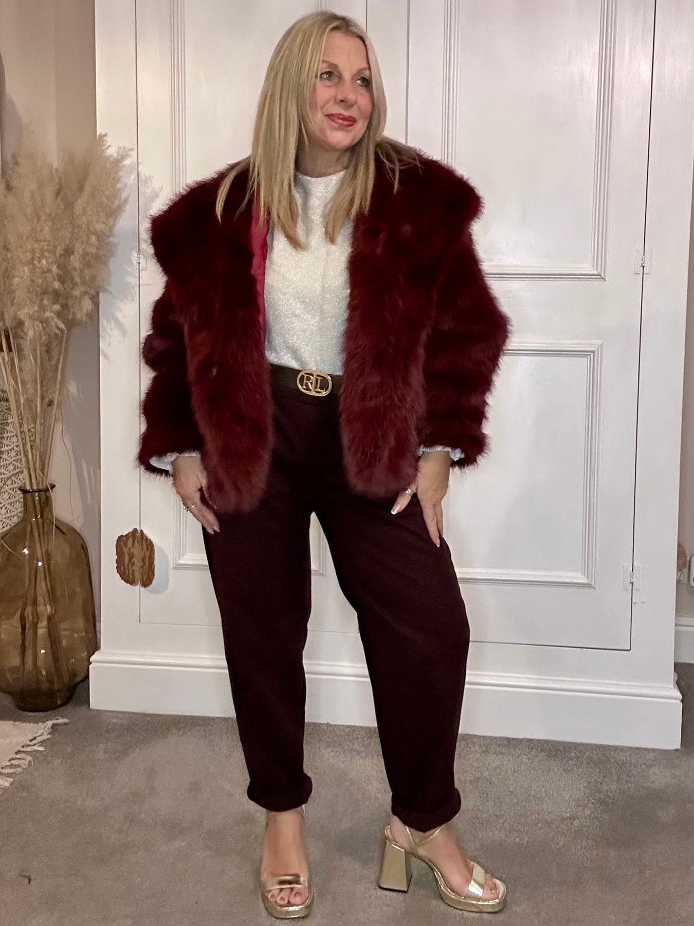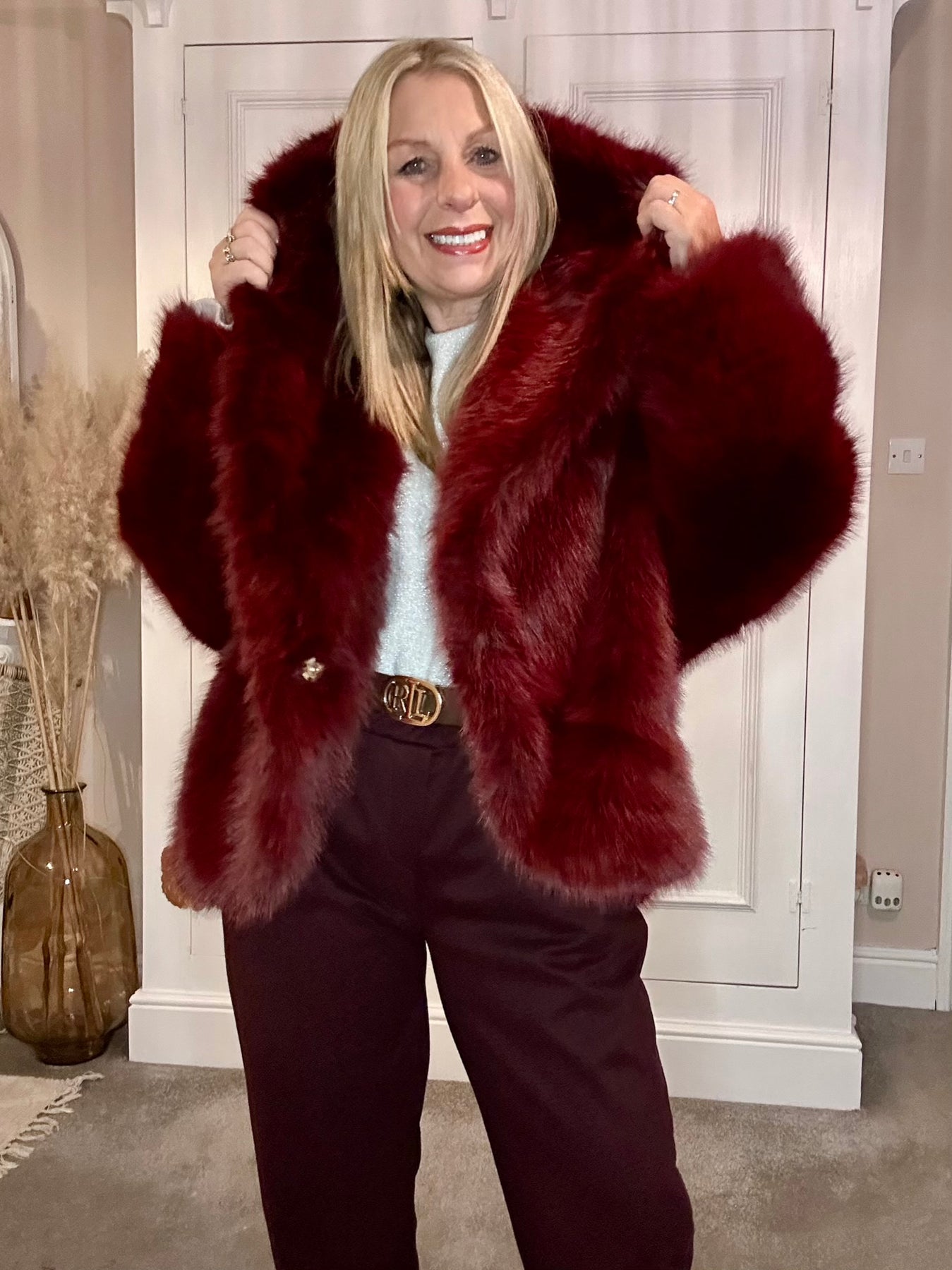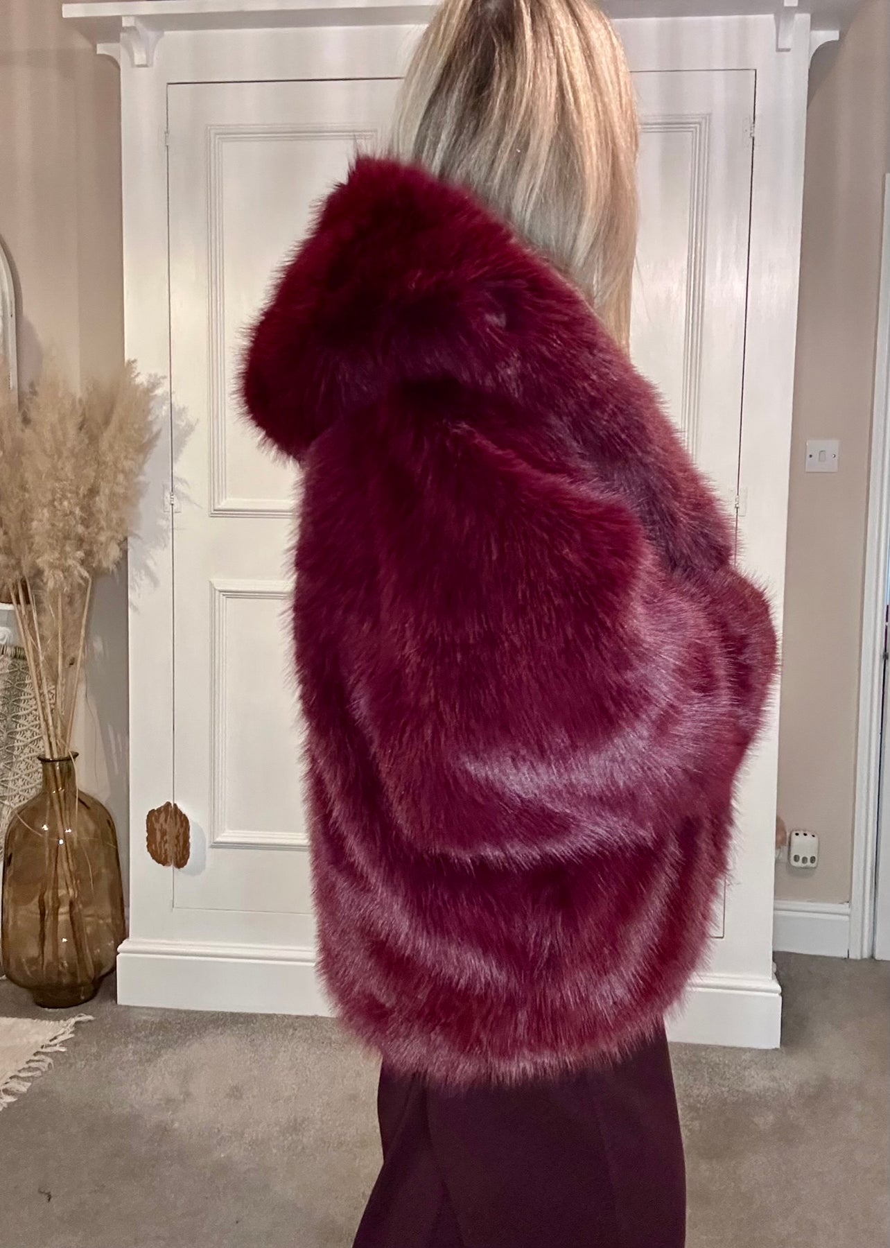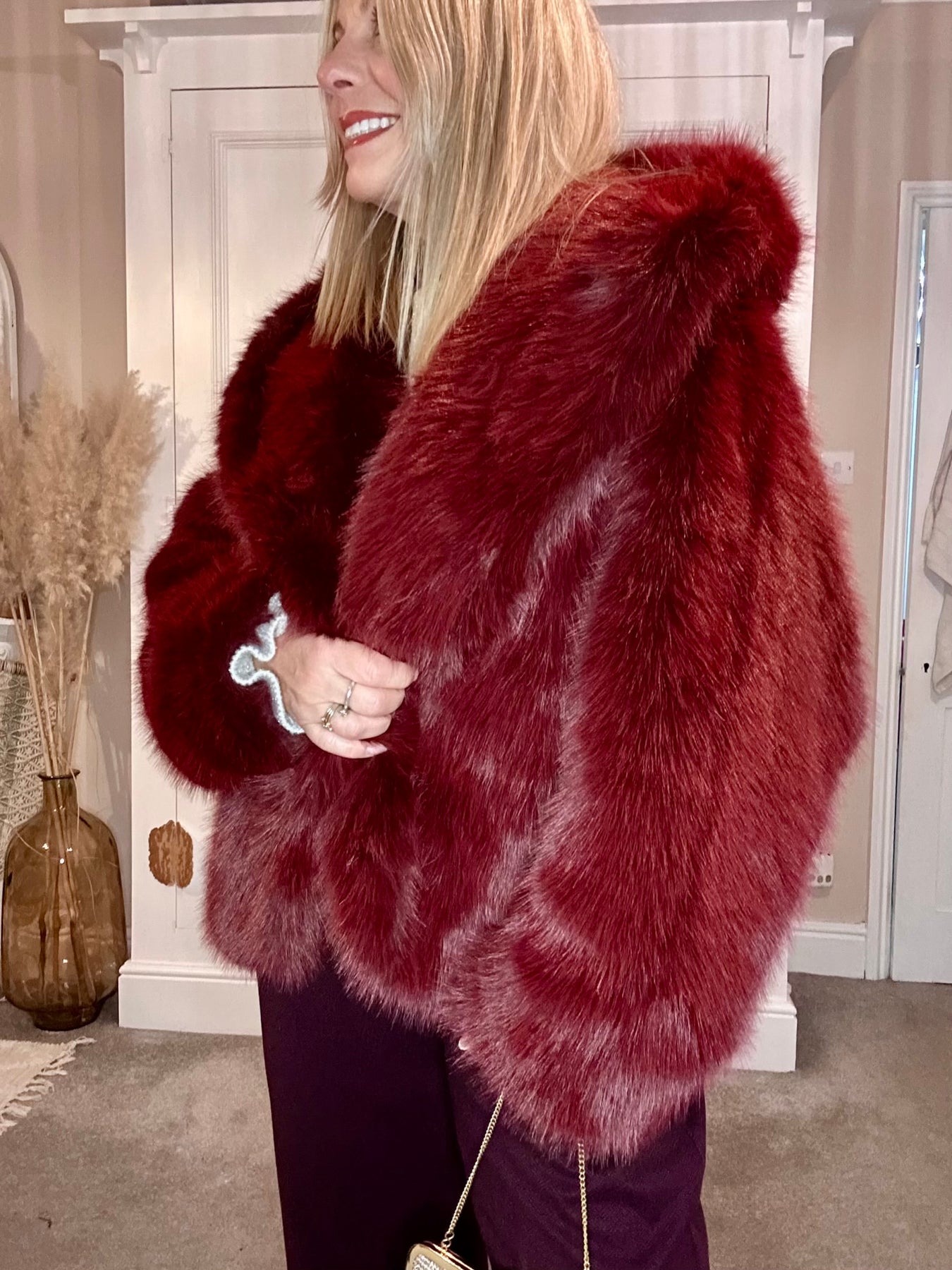 The Crimson Ember Faux Fur Hooded Jacket. A statement winter warmer with instant impact. An intro soft premium faux fur jacket with a statement hood large collar in a deep wine red colour that catches the light perfectly. Designed with a relaxed, throw-on silhouette, it drapes effortlessly for a luxe yet wearable feel. Fully lined