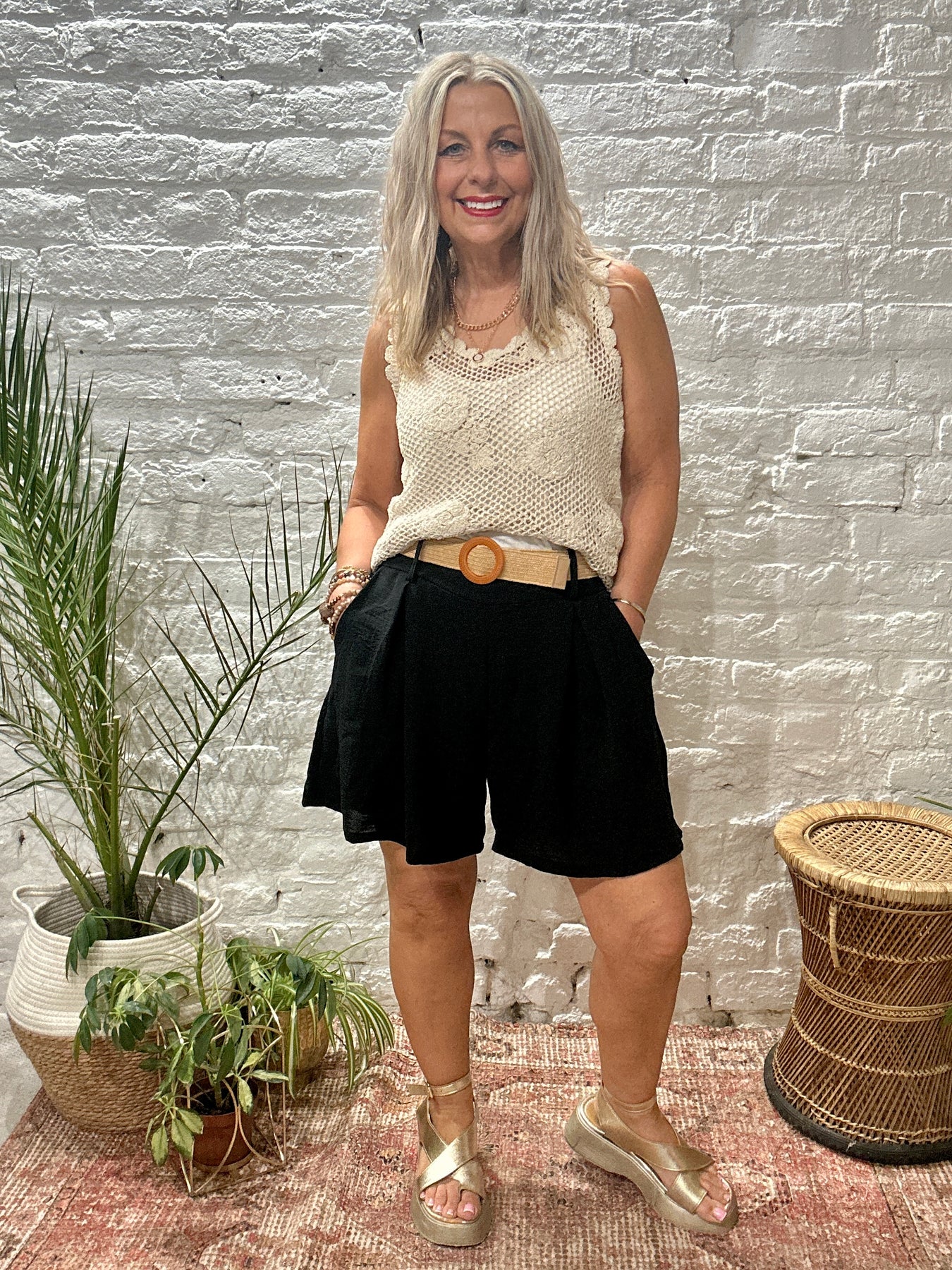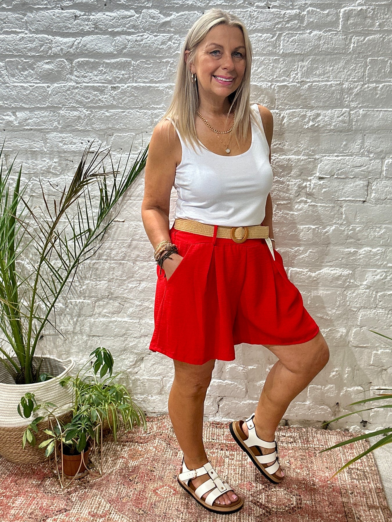 The Lucy Hi Waist Shorts With Gentle Pleats and a natural woven Belt