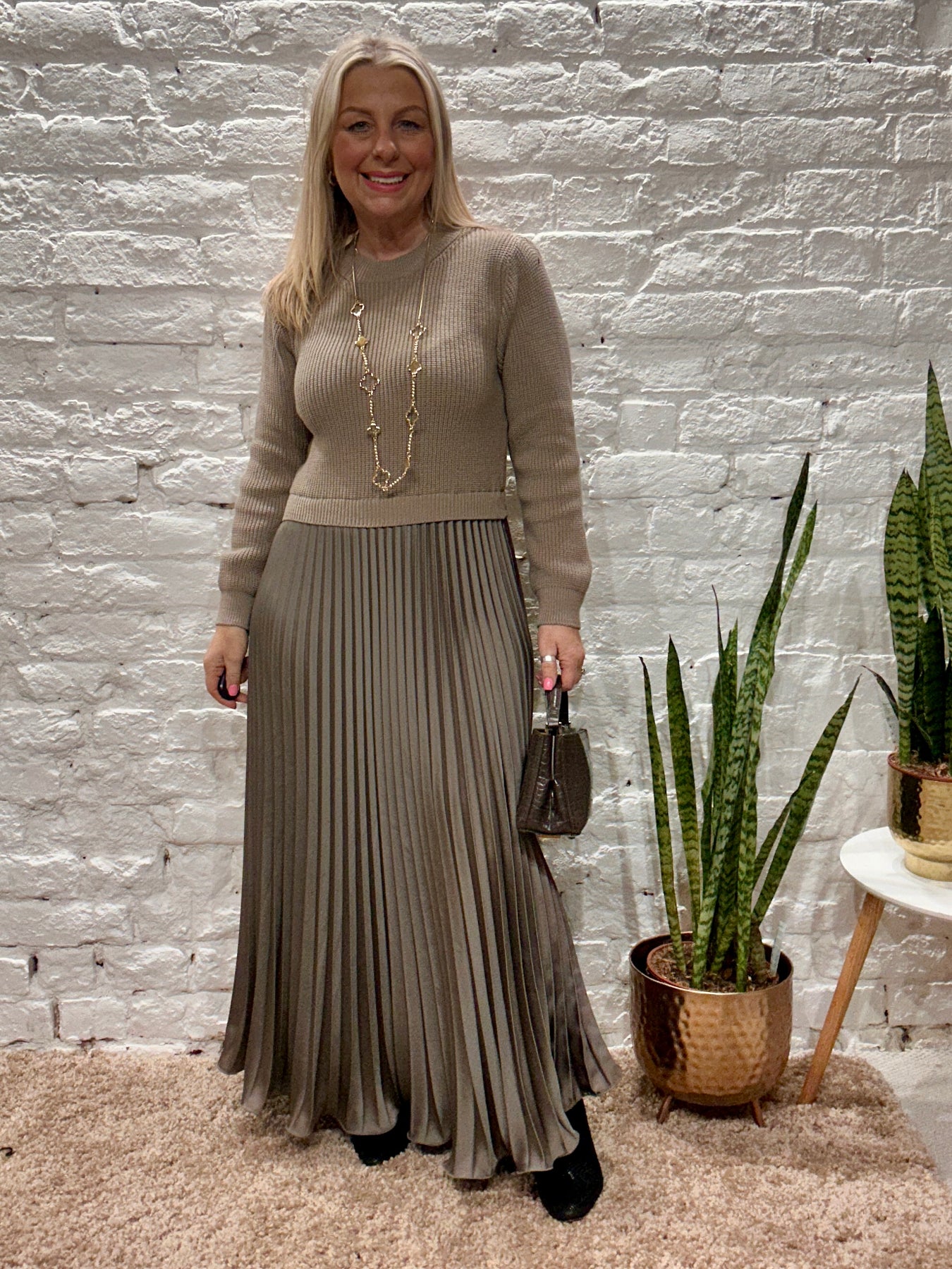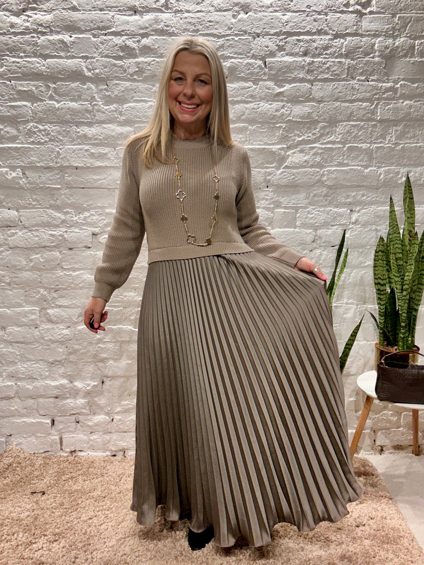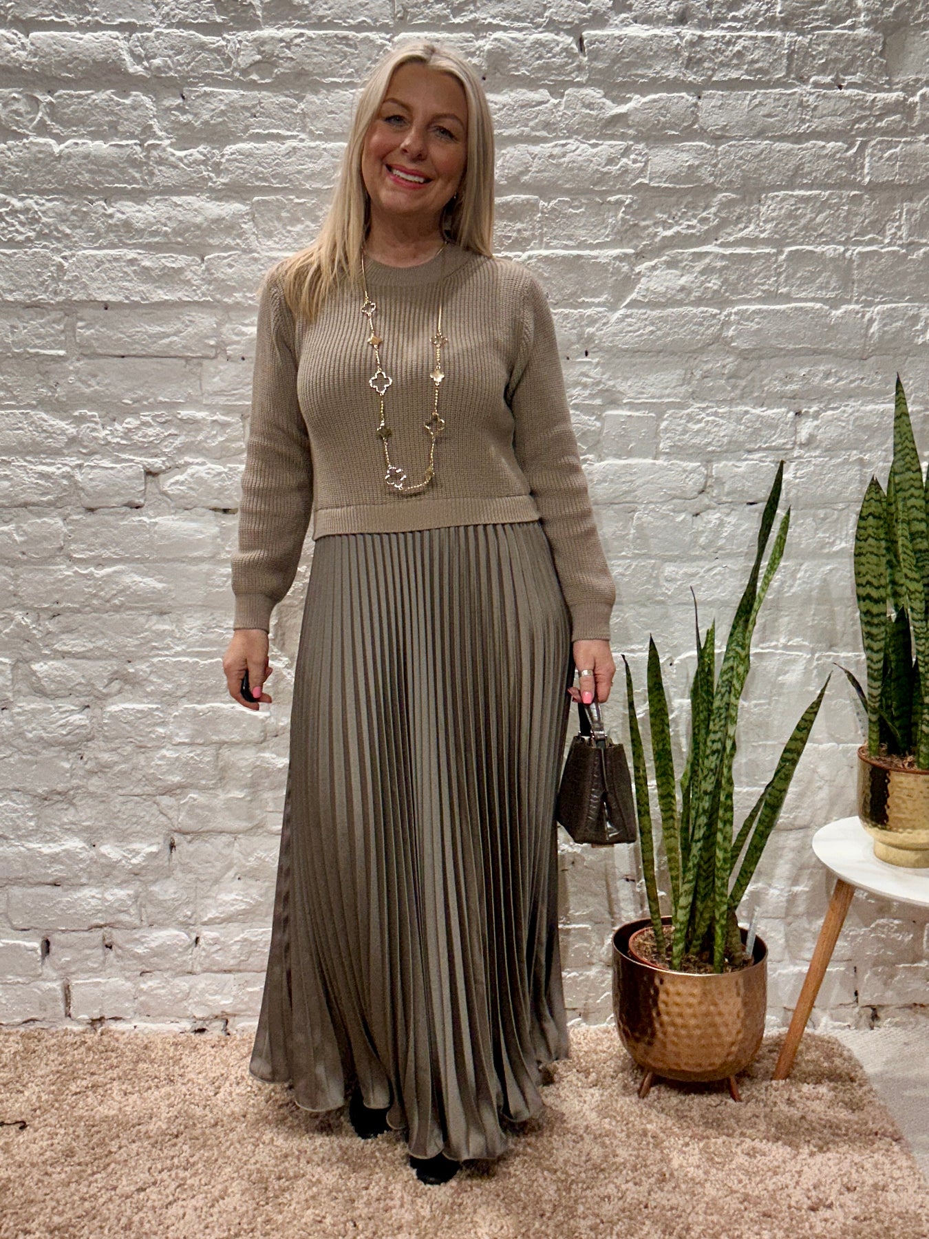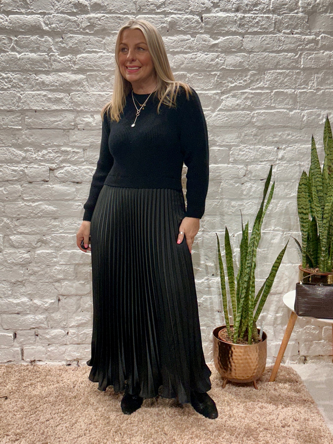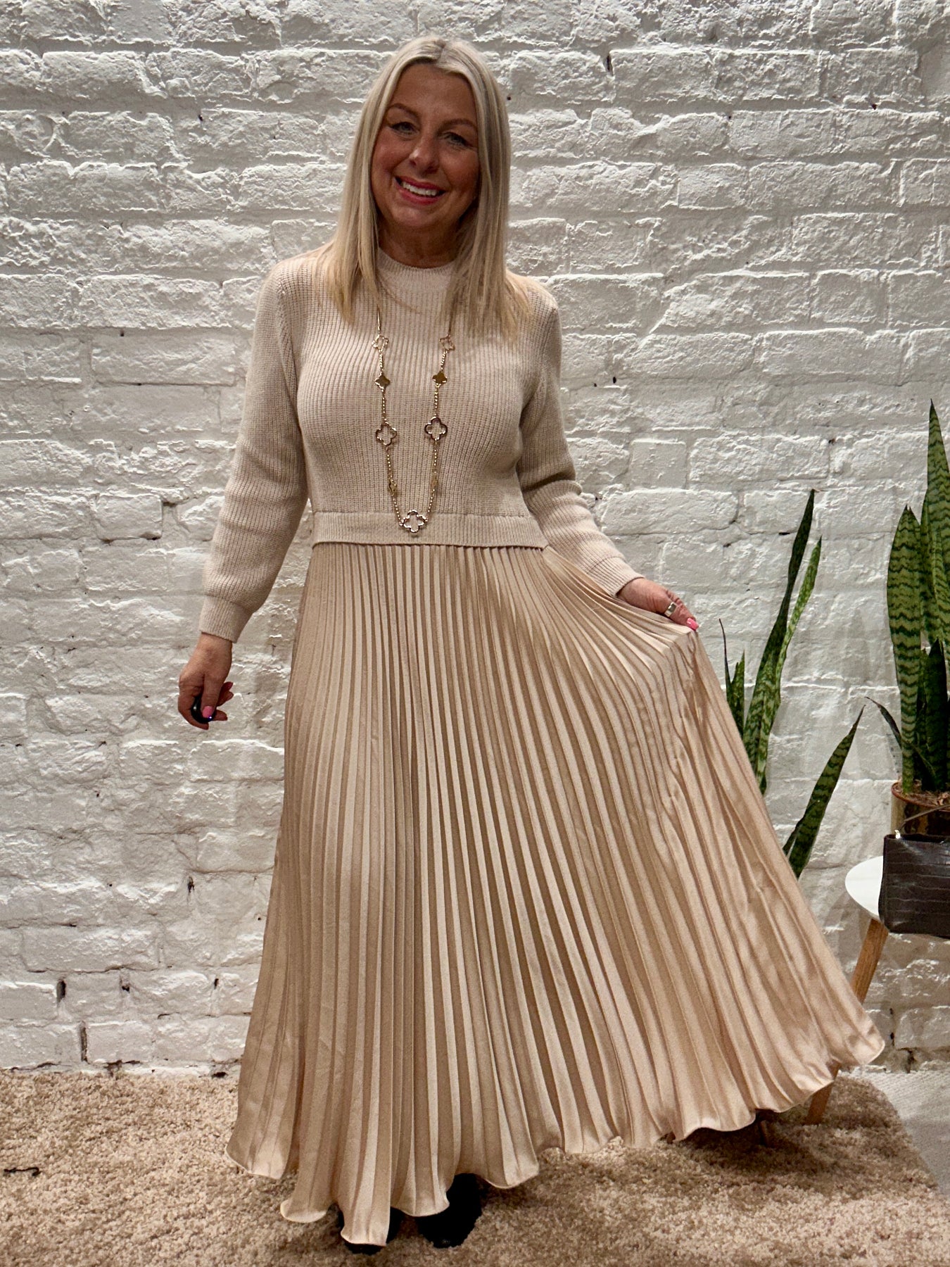 The Neve Long maxi Jumper Maxi Dress With Pleated Satin Style Skirt Bottom