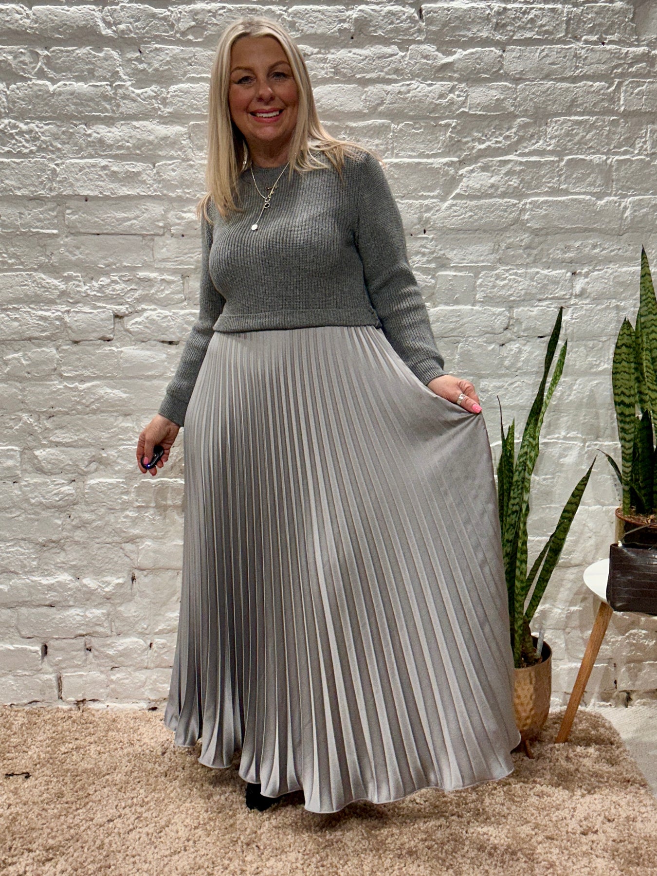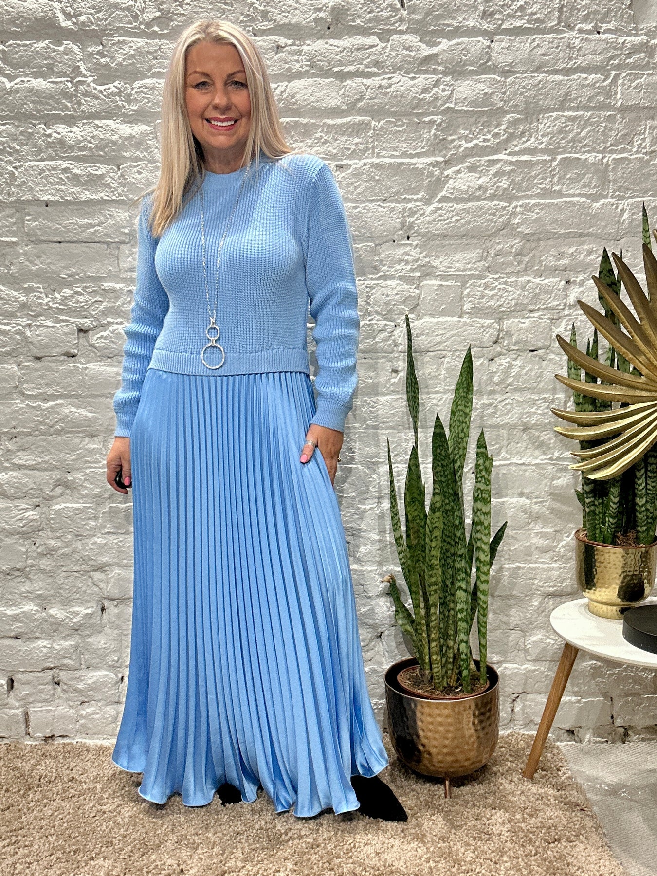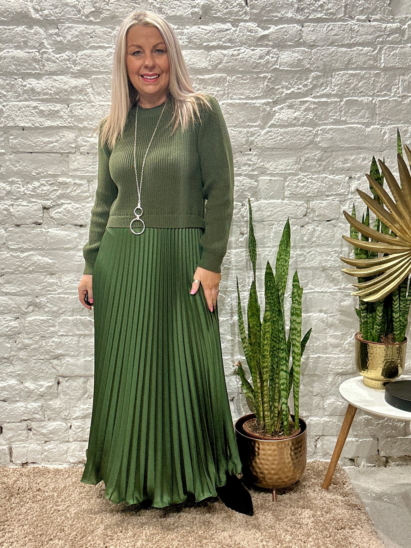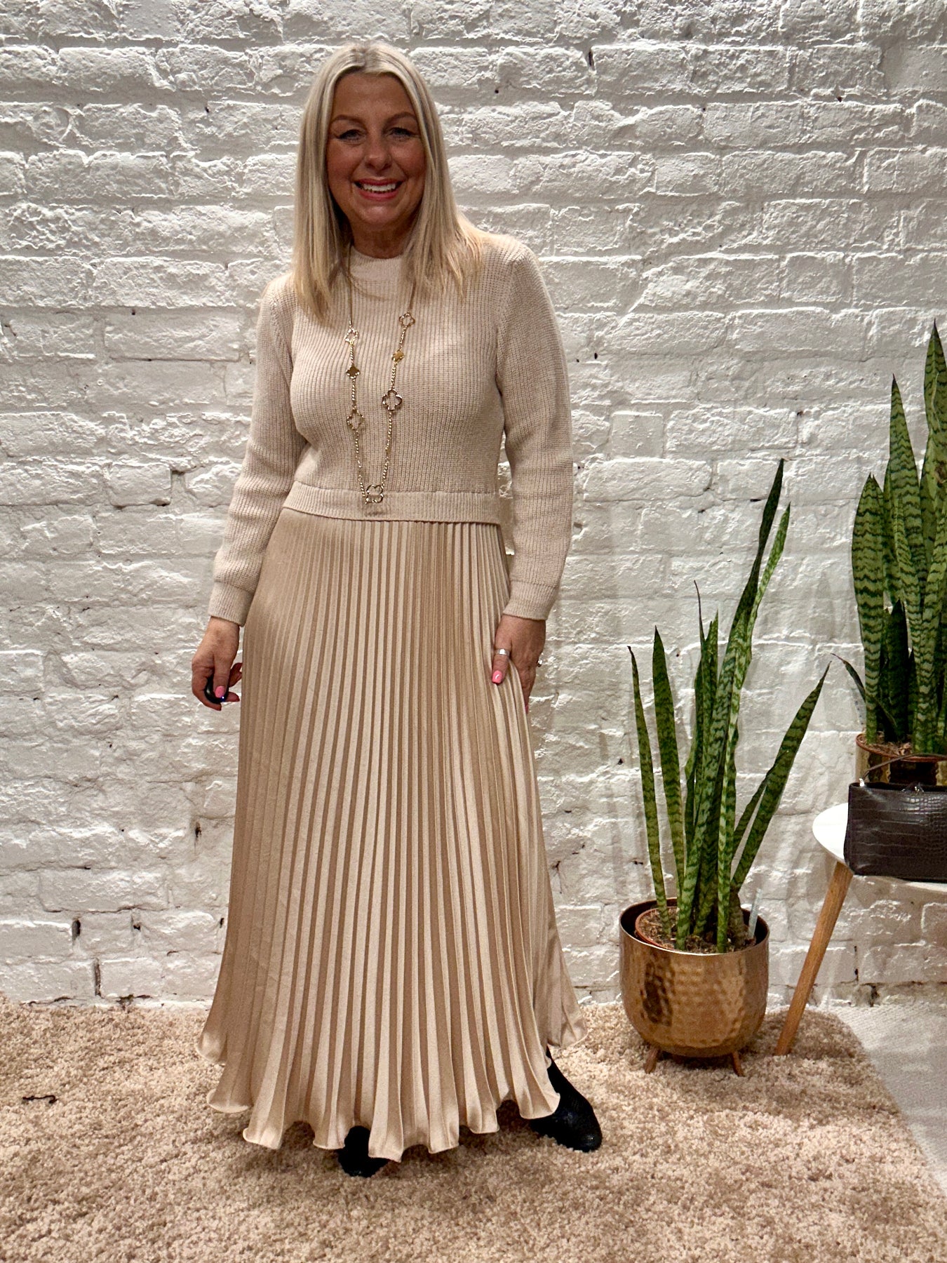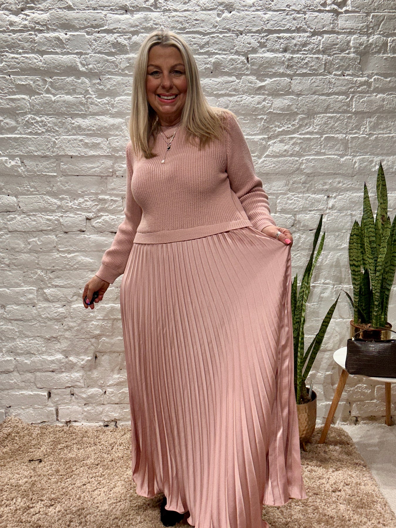 The Neve Long maxi Jumper Maxi Dress With Pleated Satin Style Skirt Bottom