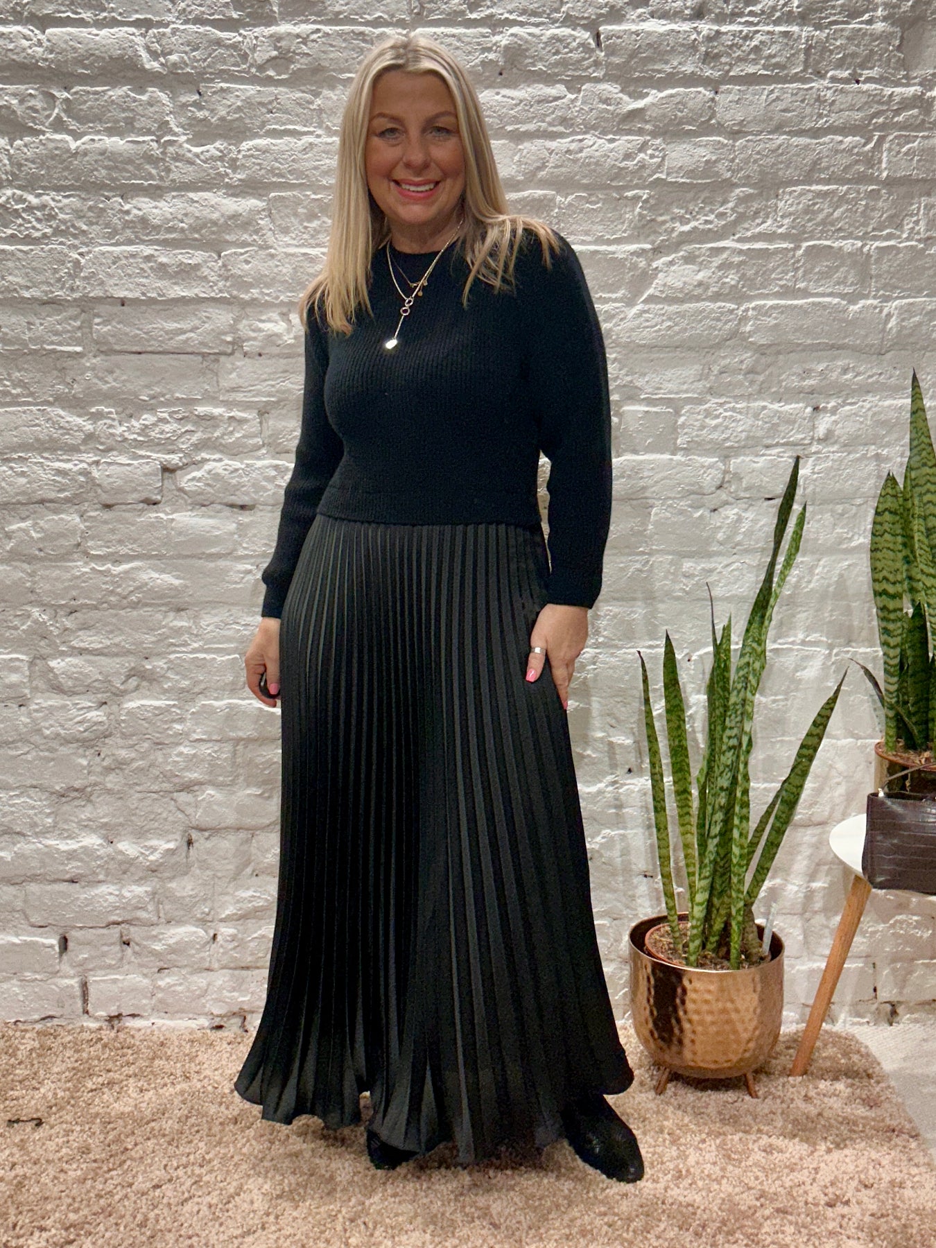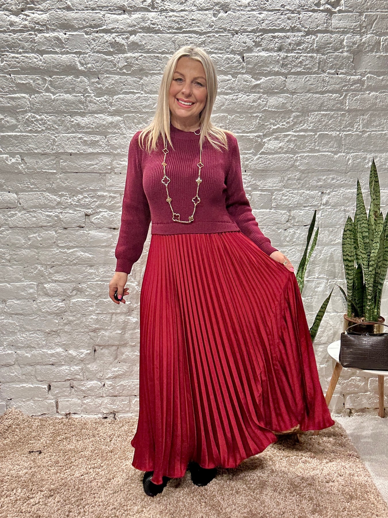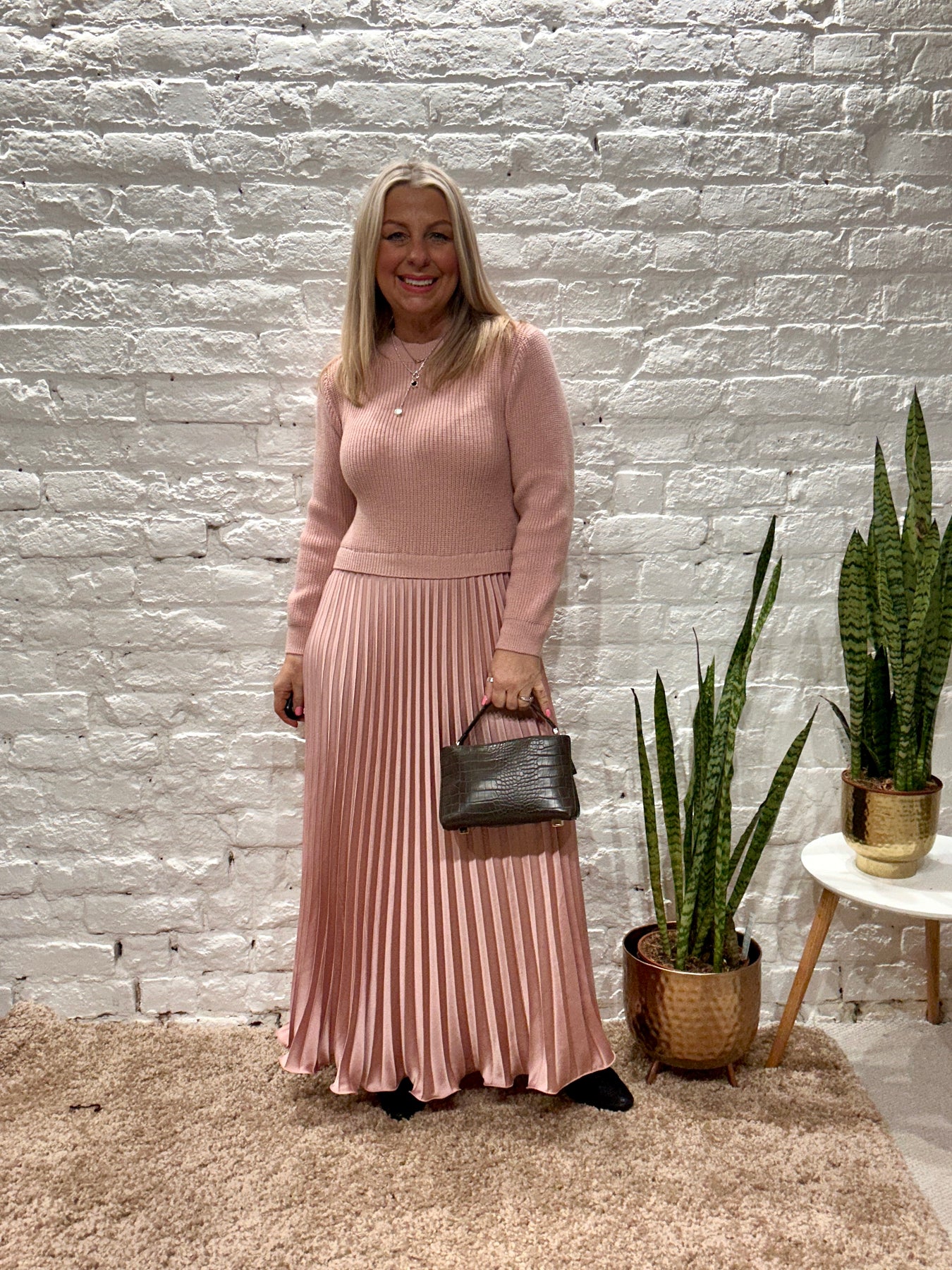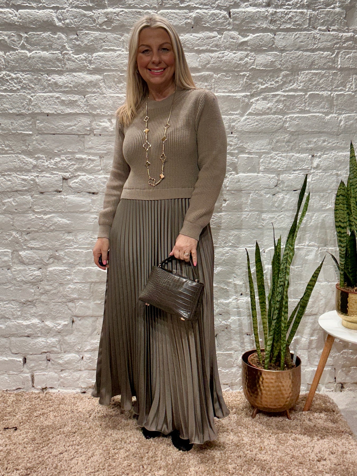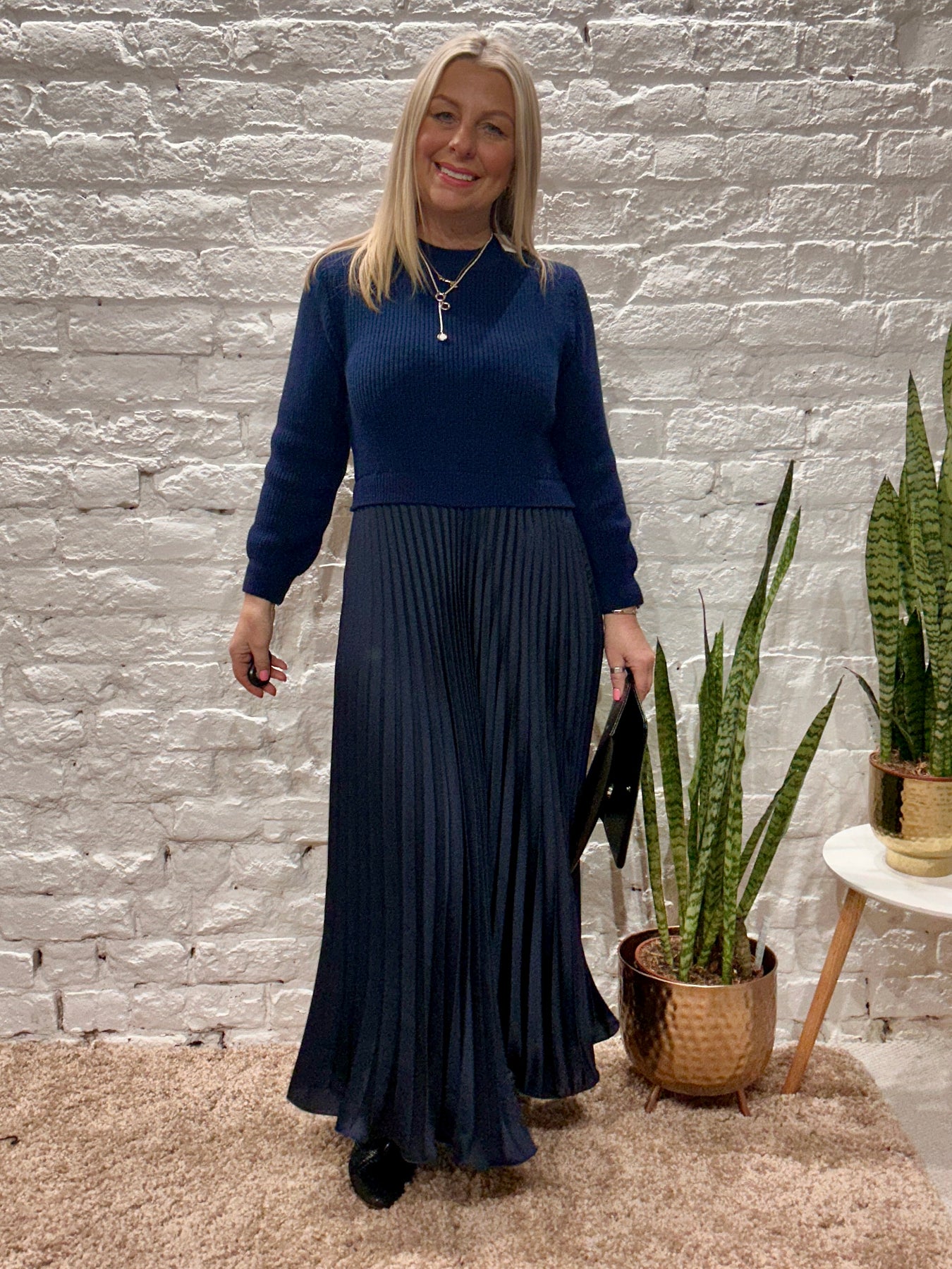 The Neve Long maxi Jumper Maxi Dress With Pleated Satin Style Skirt Bottom