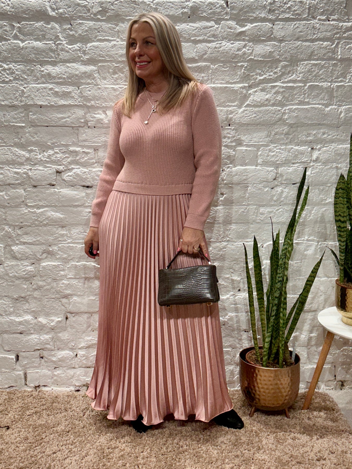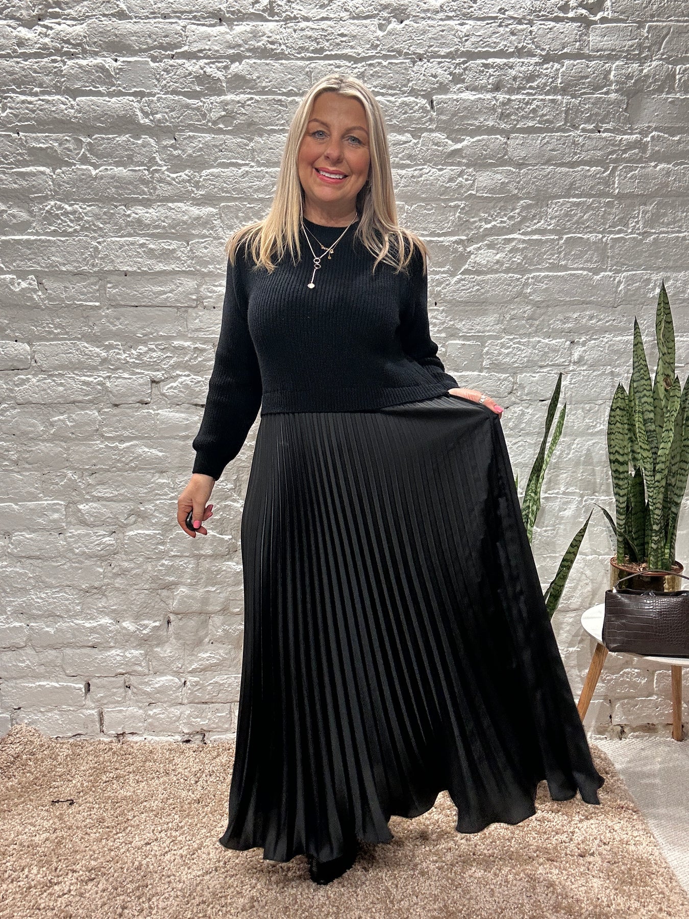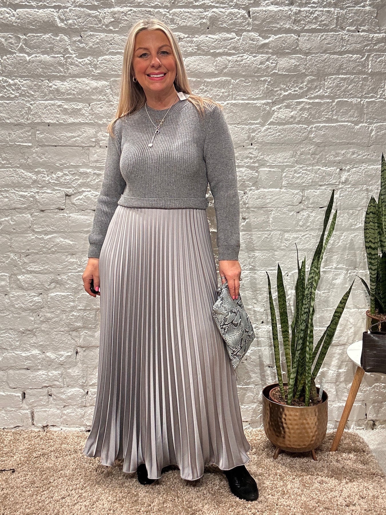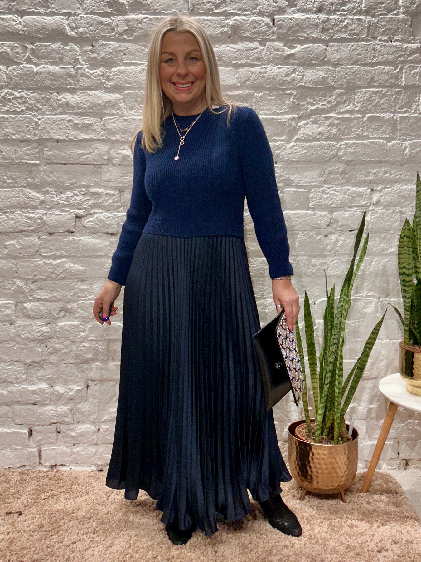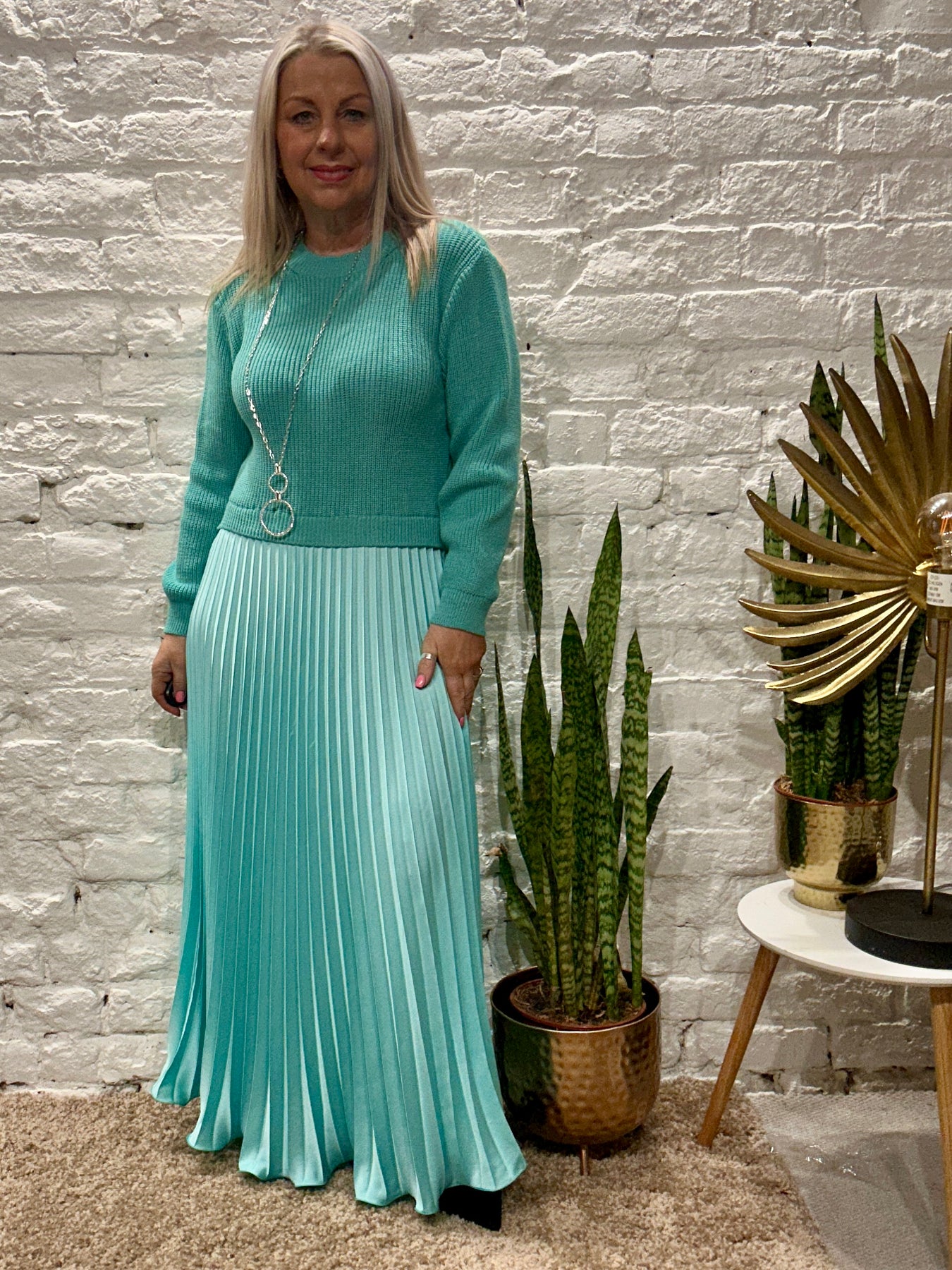 The Neve Long maxi Jumper Maxi Dress With Pleated Satin Style Skirt Bottom