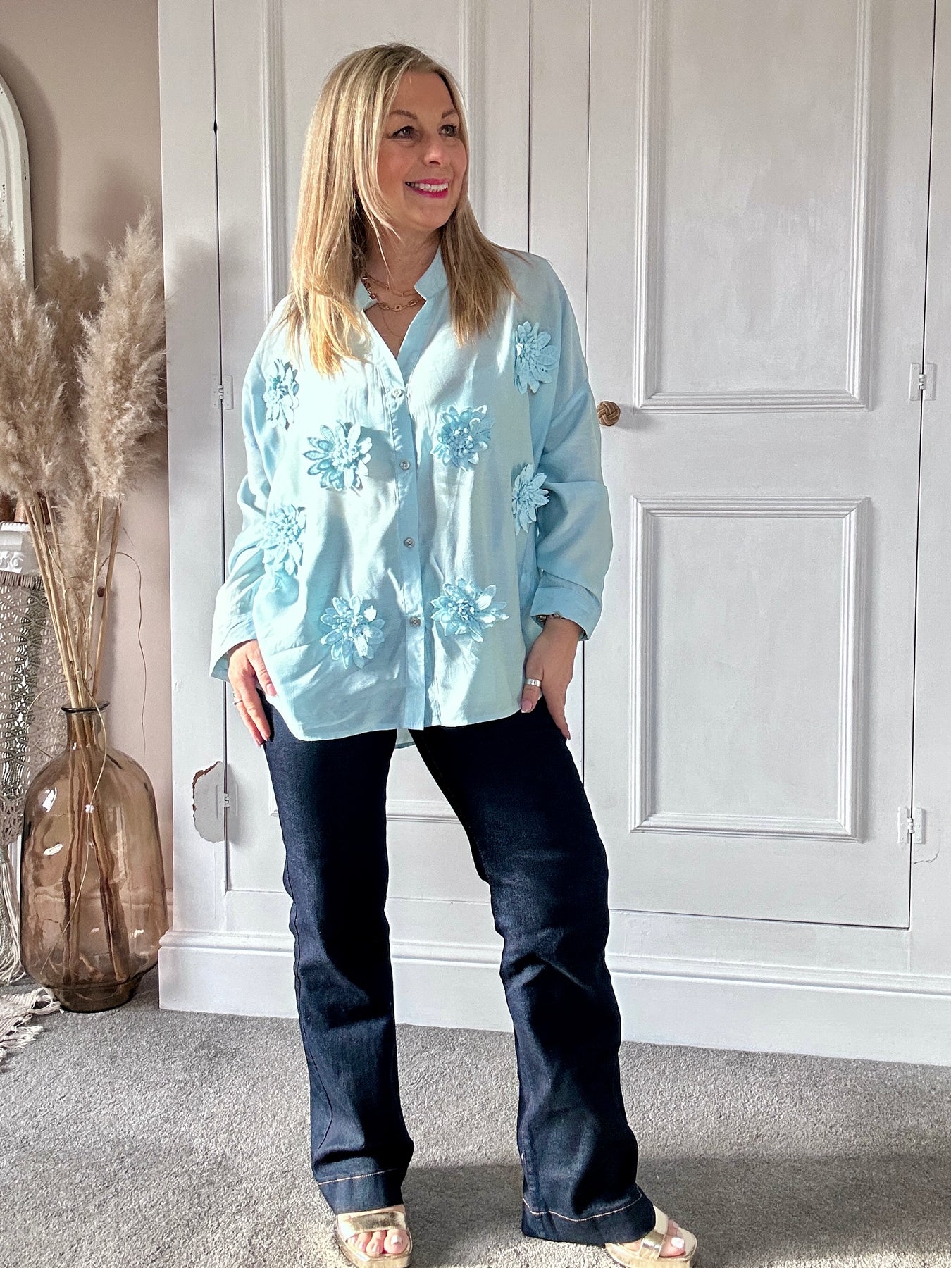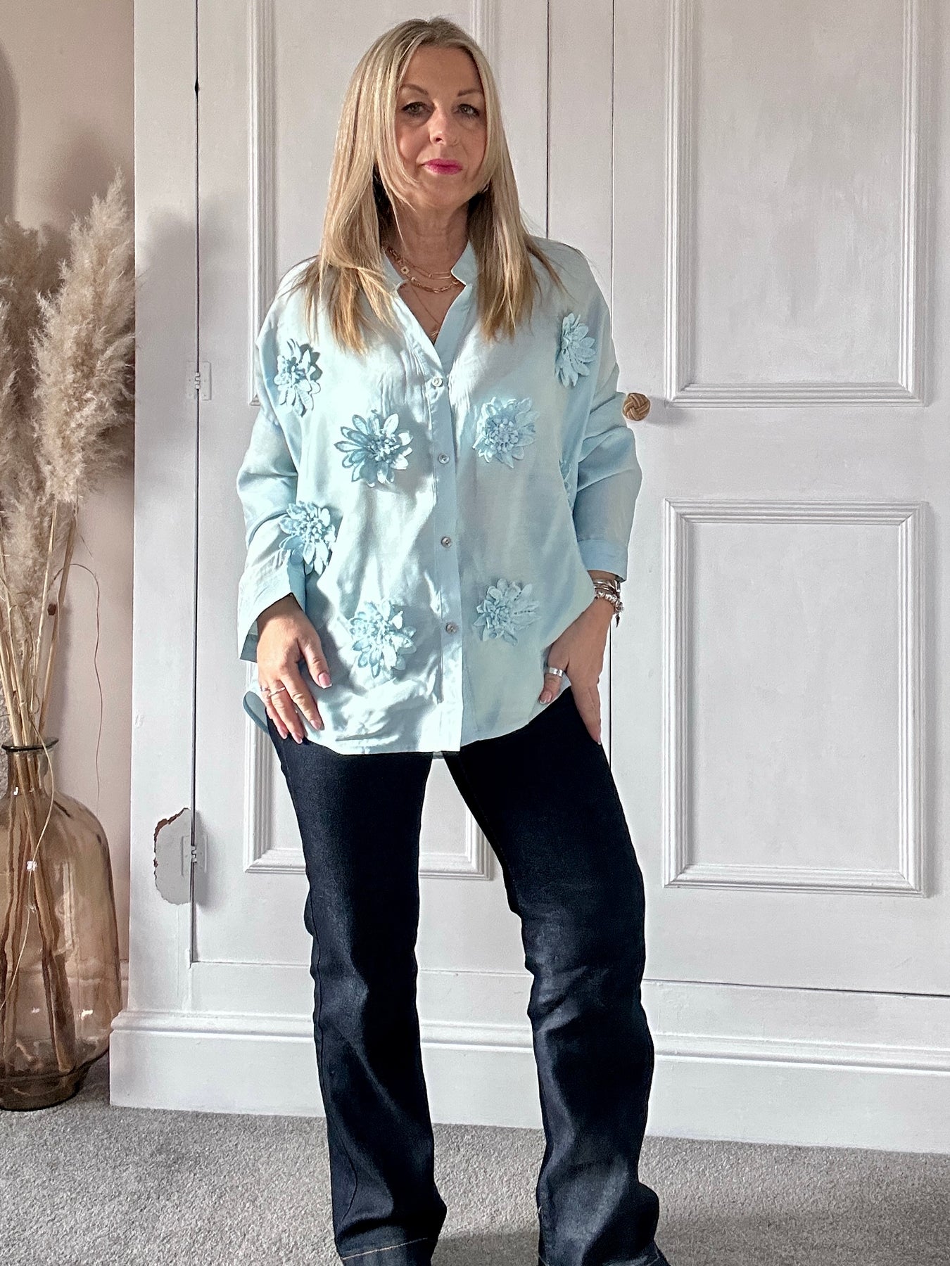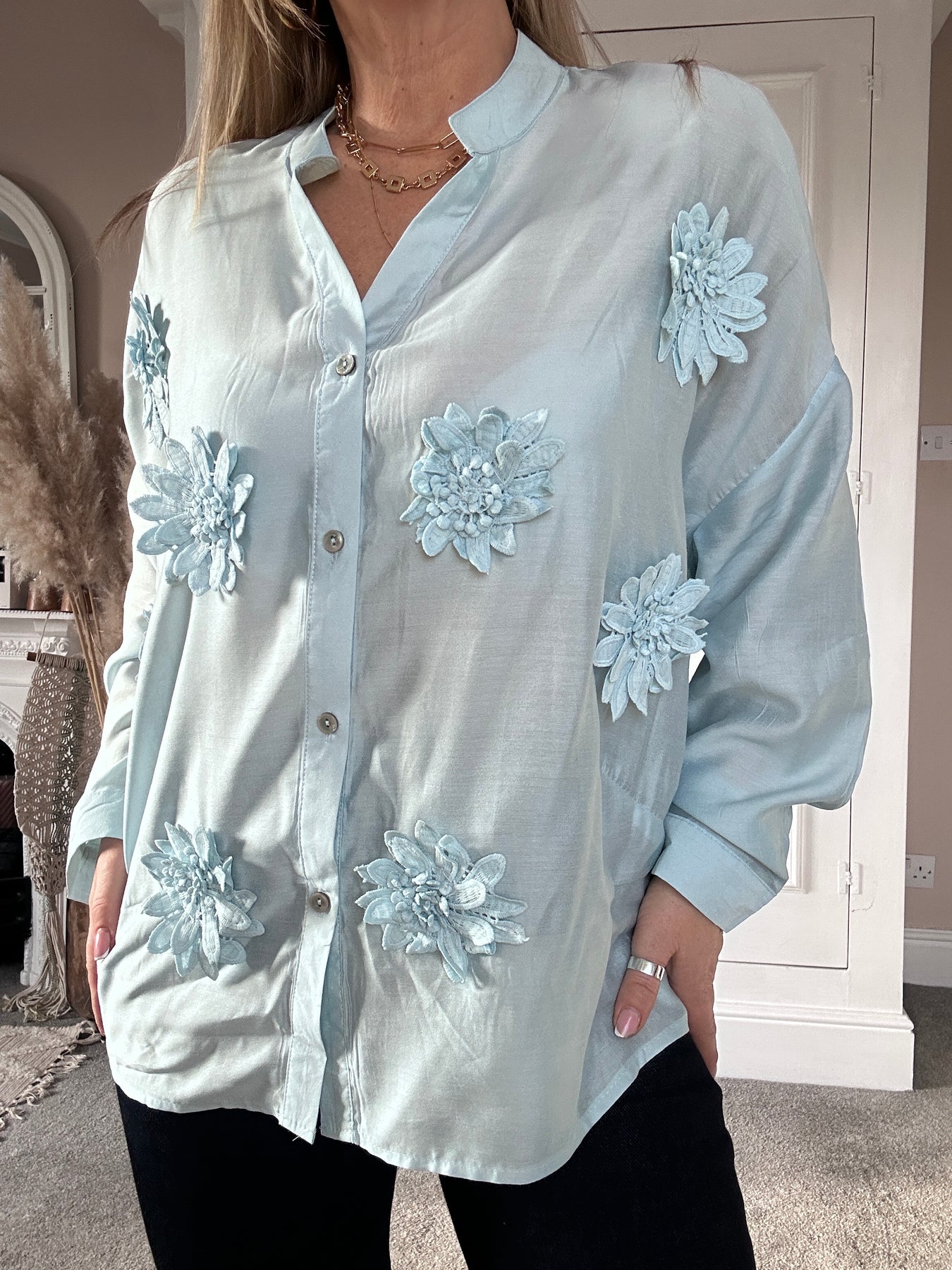 A soft, airy sheer shirt in a delicate pastel hue, elevated with statement 3D floral appliqués that add texture and charm. Its relaxed, effortless drape pairs beautifully with dark straight-leg denim for a chic, easygoing look. Finished with a button-through front and subtly voluminous sleeves, this piece brings a fresh, feminine feel that transitions seamlessly from daytime styling to relaxed evening wear.