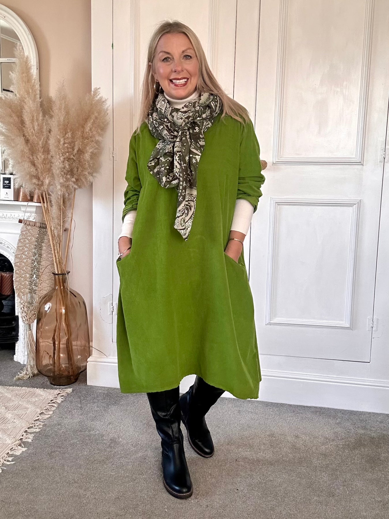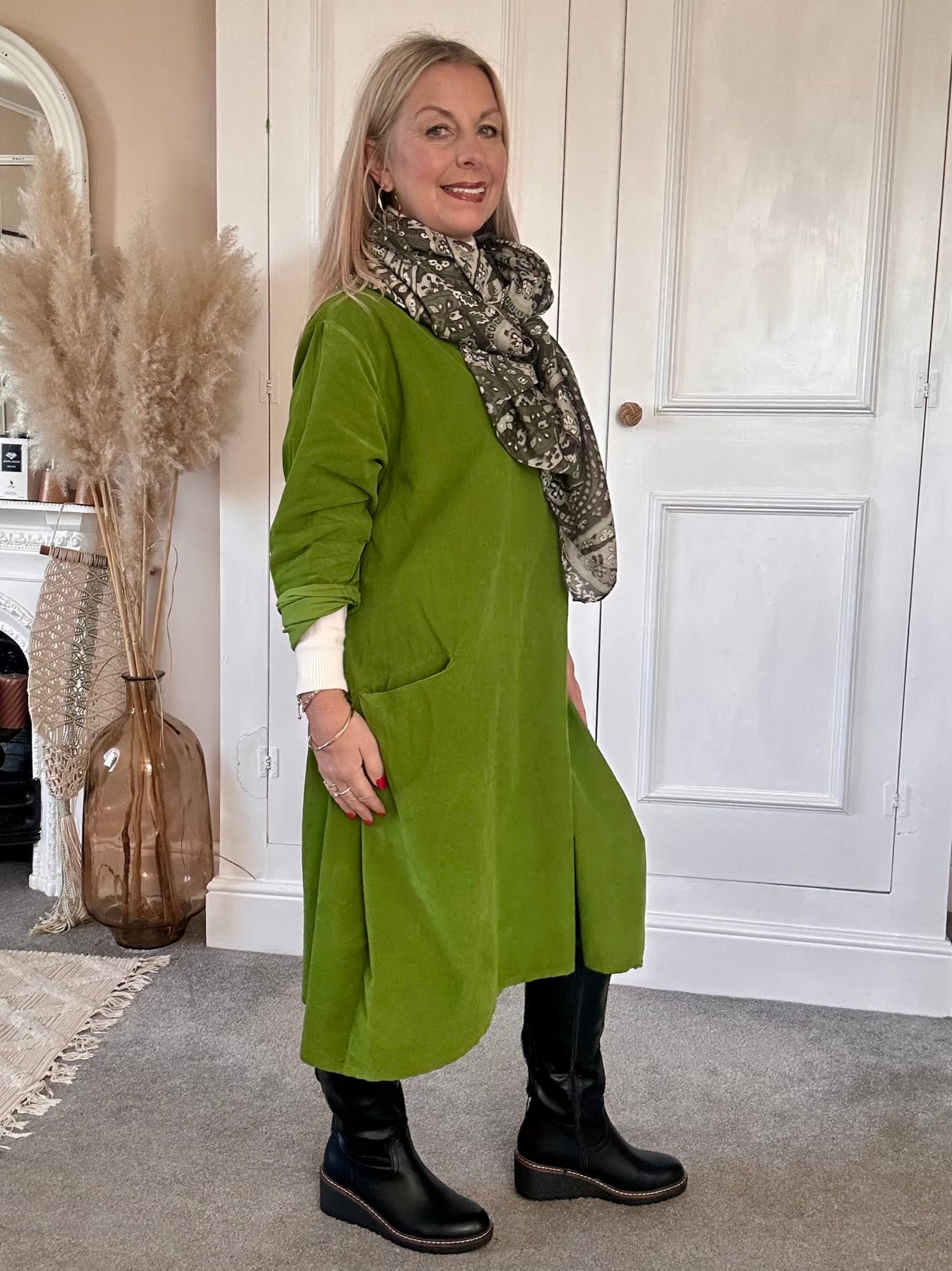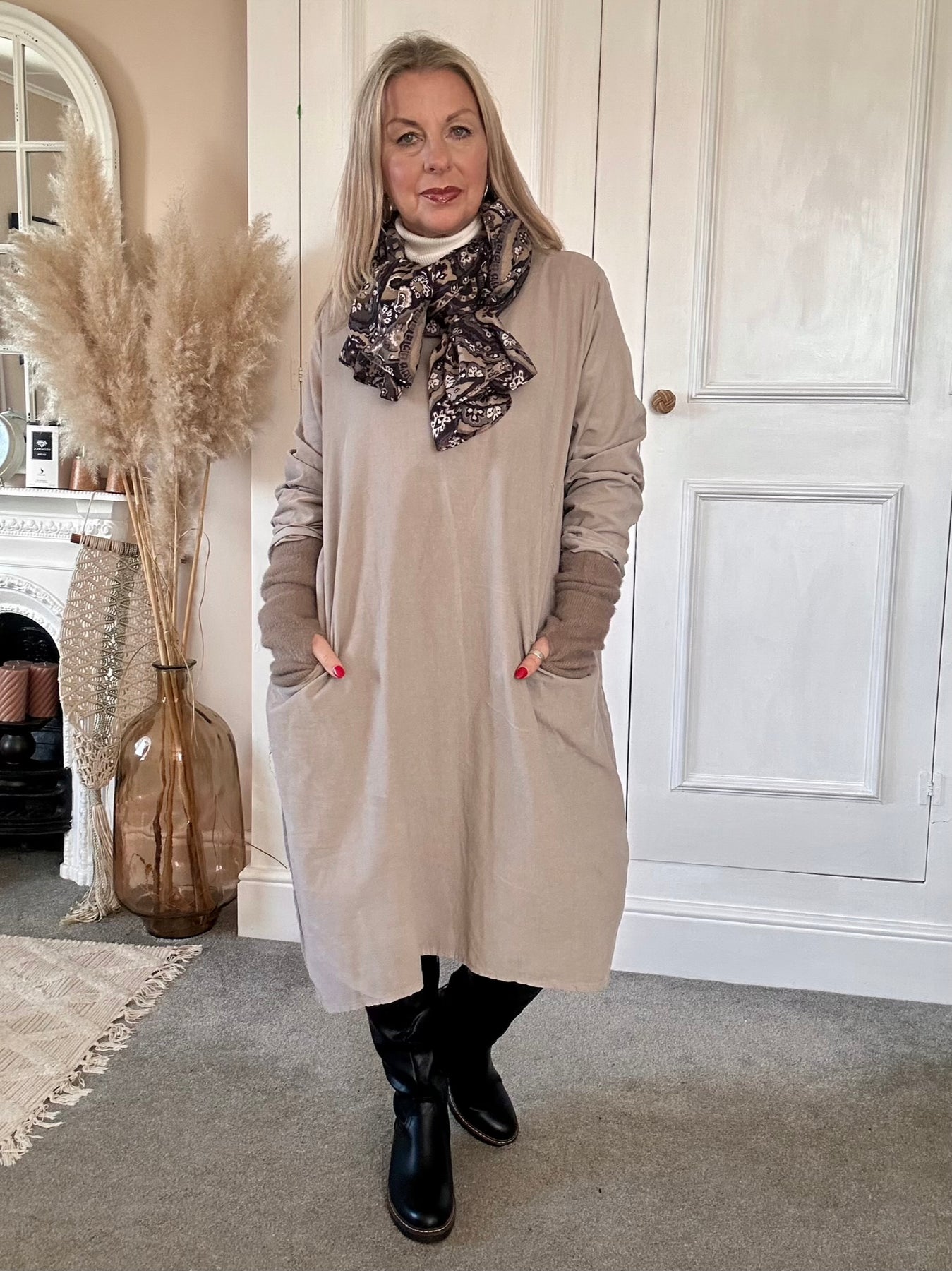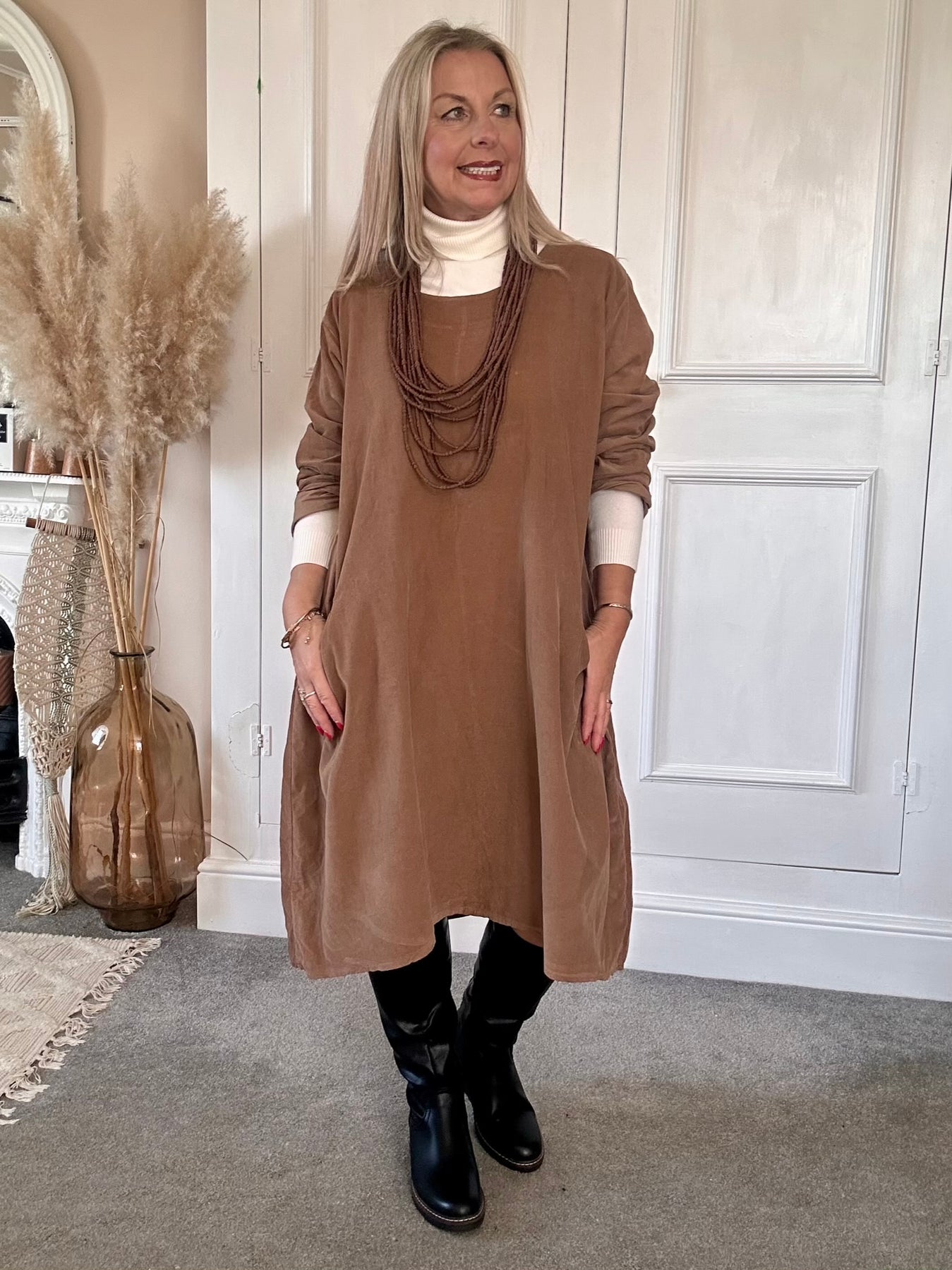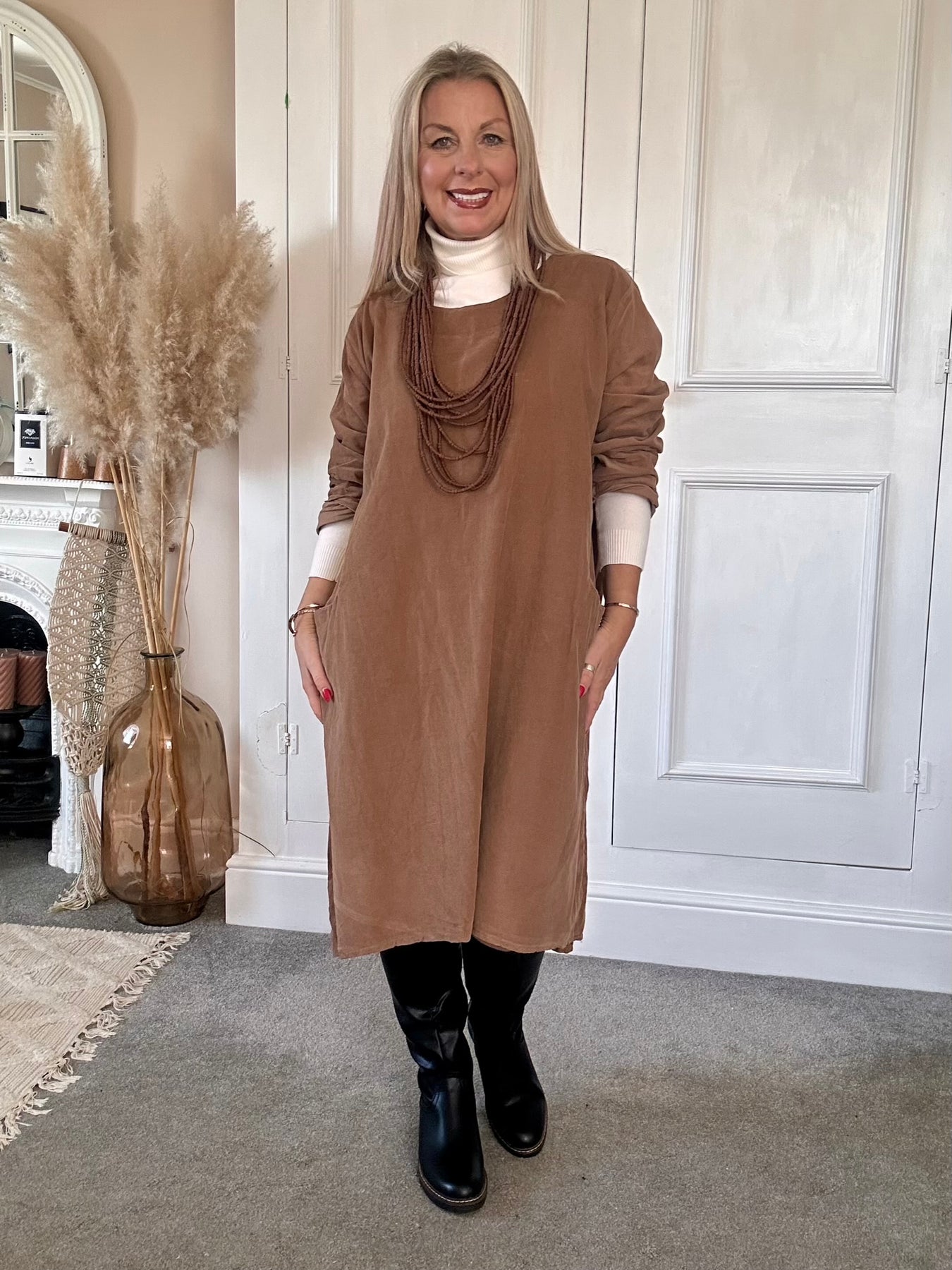 The Pincord Cordroy Willow Relaxed Dress. A beautifully relaxed silhouette crafted in soft pin cord, this lagenlook-style dress blends effortless comfort with understated style. Featuring gentle shaping through the body, deep pockets, and a flowing drape that layers perfectly over lightweight tops or rollnecks, it’s a piece made for easy, everyday wear. Finished with subtle texture and a tactile cord feel, it brings warmth and character to your autumn wardrobe.