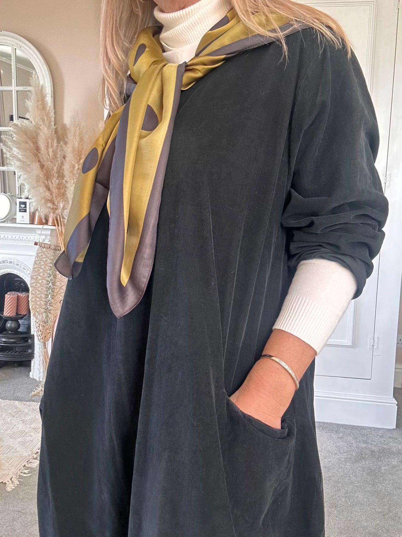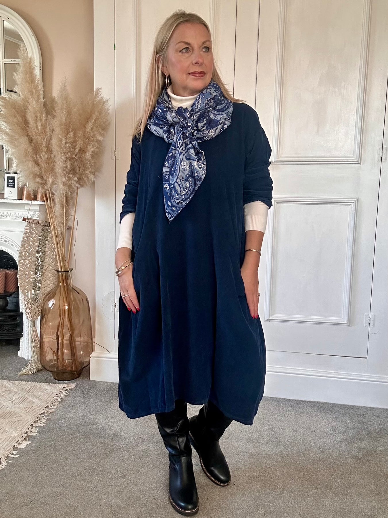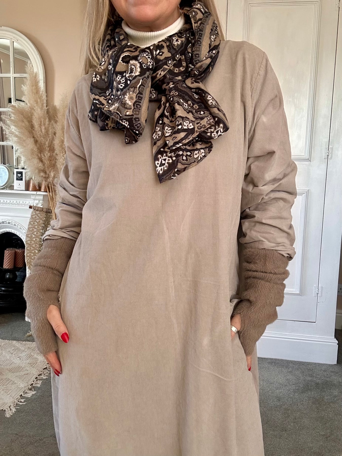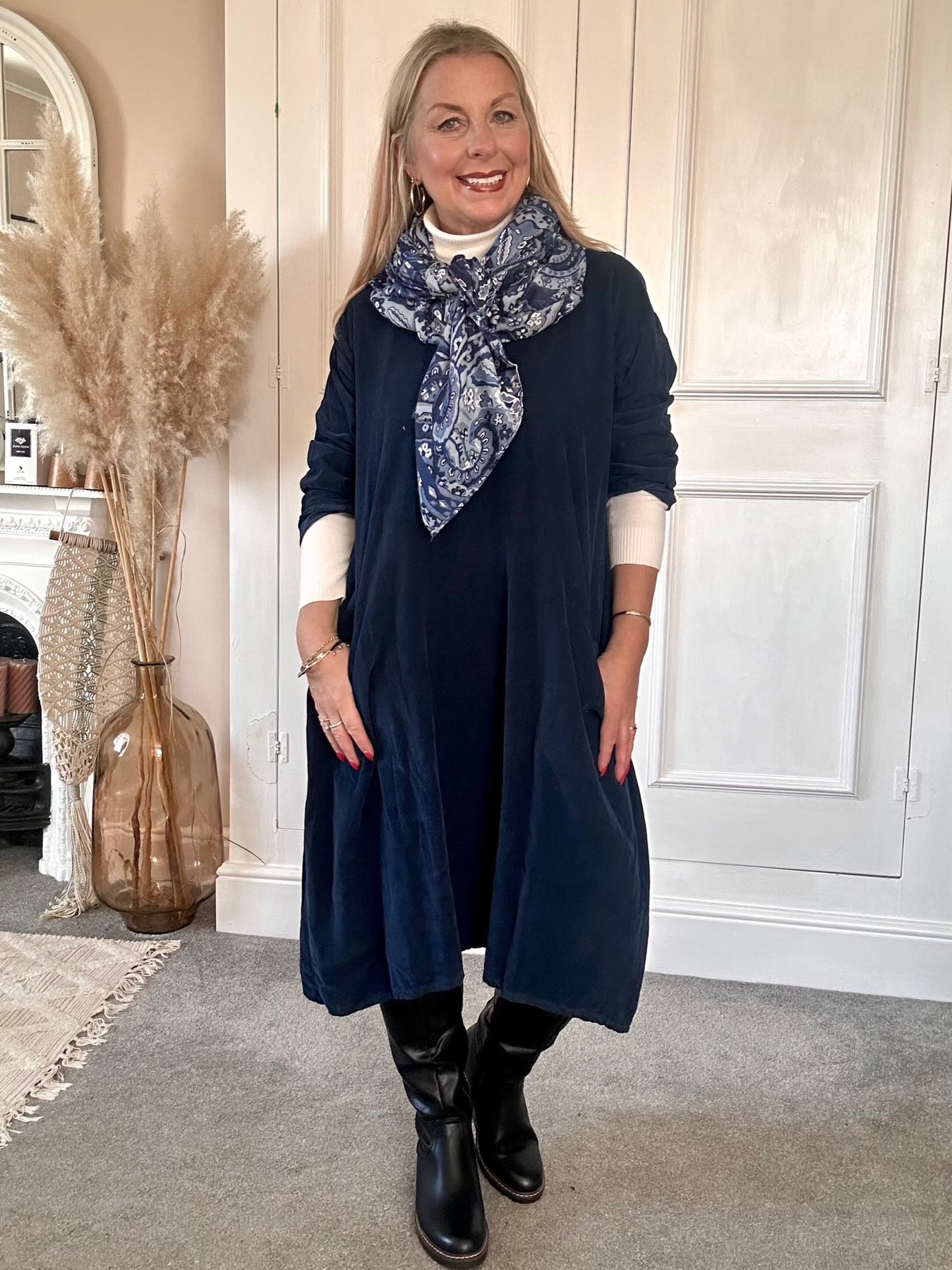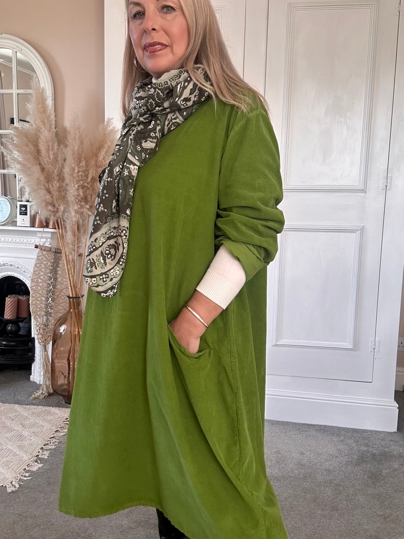 The Pincord Cordroy Willow Relaxed Dress. A beautifully relaxed silhouette crafted in soft pin cord, this lagenlook-style dress blends effortless comfort with understated style. Featuring gentle shaping through the body, deep pockets, and a flowing drape that layers perfectly over lightweight tops or rollnecks, it’s a piece made for easy, everyday wear. Finished with subtle texture and a tactile cord feel, it brings warmth and character to your autumn wardrobe.