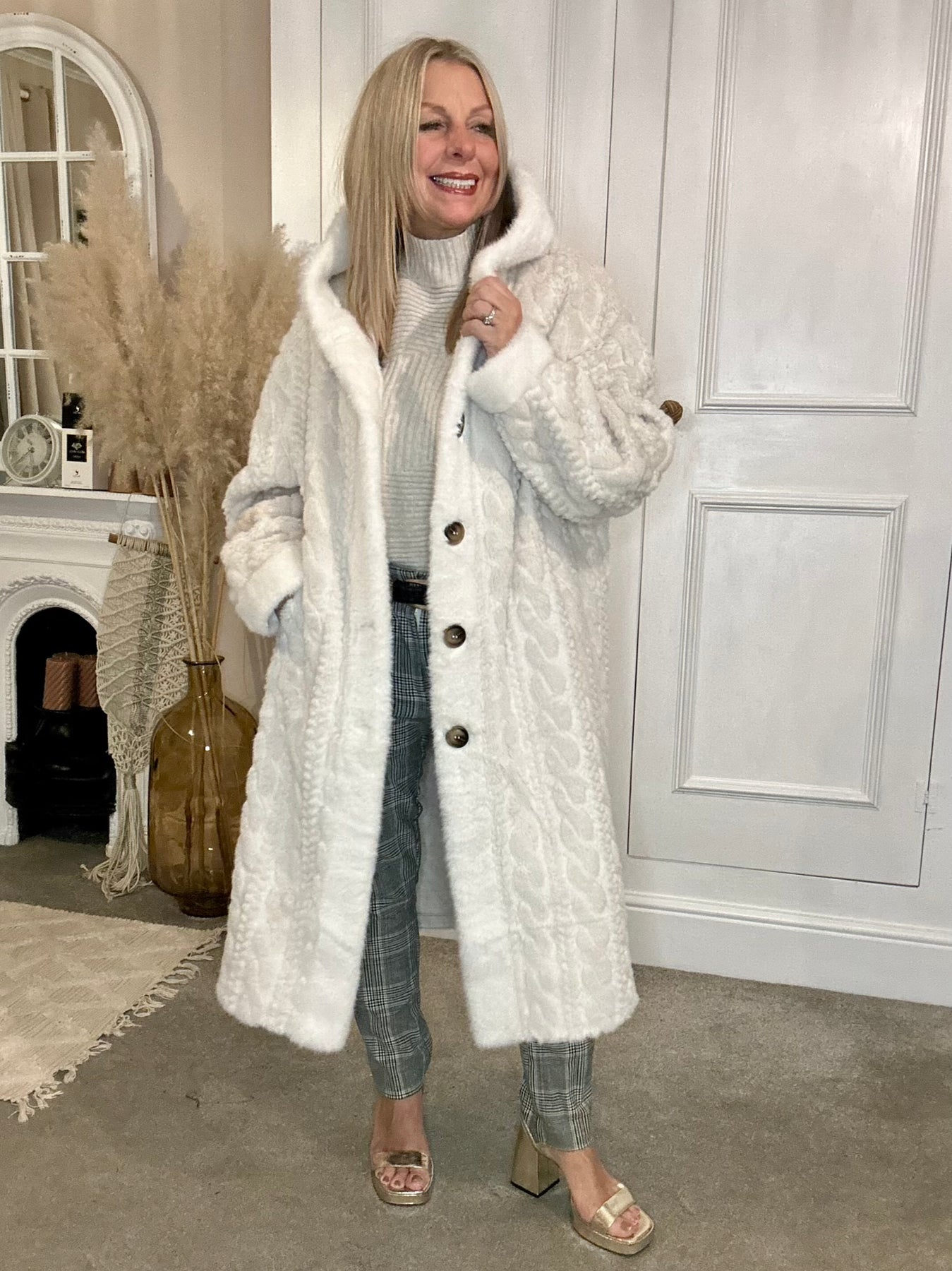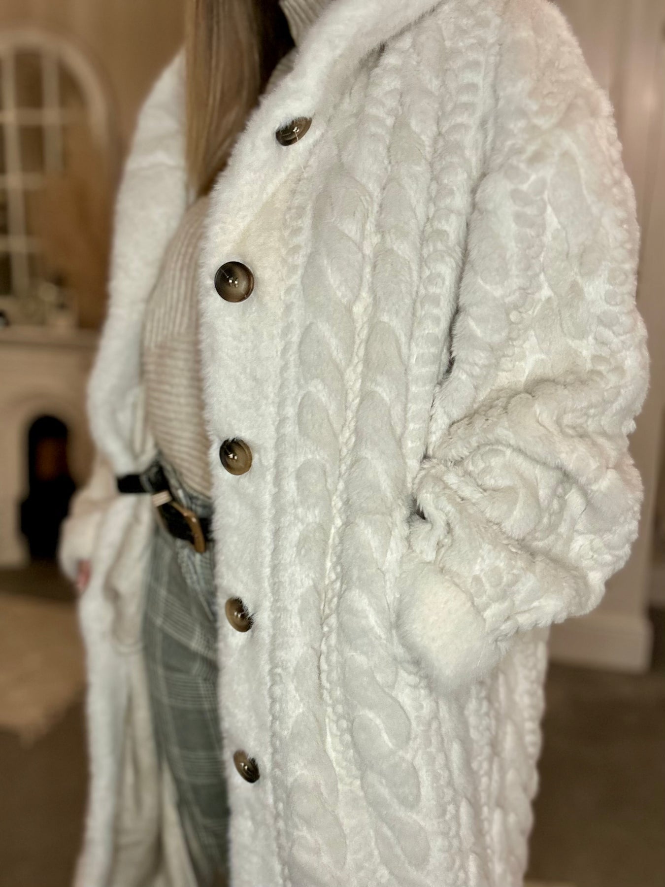 The Snow Hustle Power Faux Fur Long Coat. A stunning statement piece designed to keep you warm in ultimate style. This longline faux shearling coat features a beautiful textured finish that mimics cable-knit detail, oversized sleeves, and bold tortoiseshell buttons for a chic touch. Effortlessly elegant in a soft cream hue, it pairs perfectly with tonal knits and wide-leg trousers for a sophisticated winter look. Coat has hood