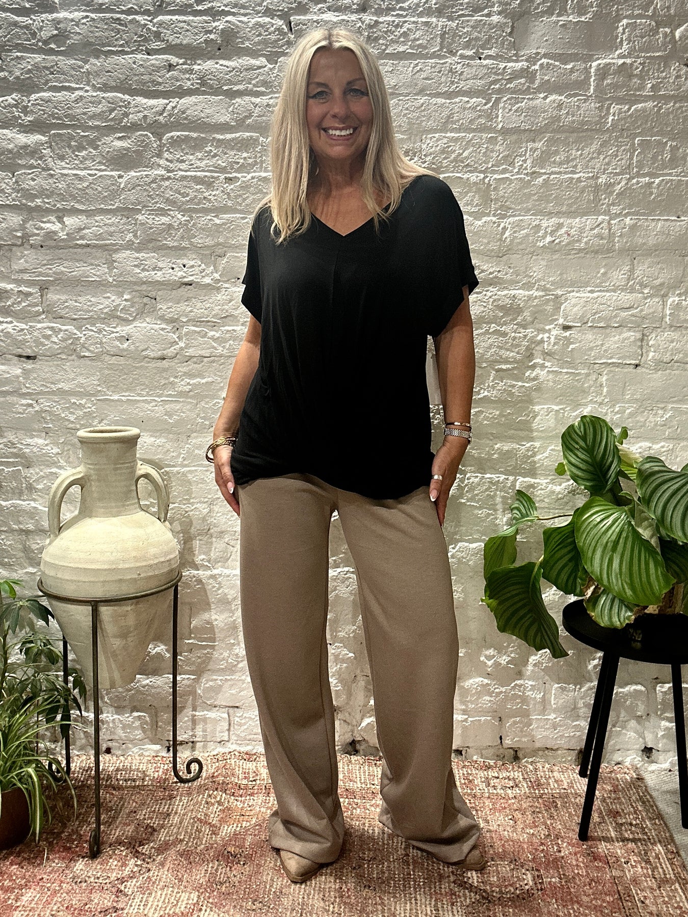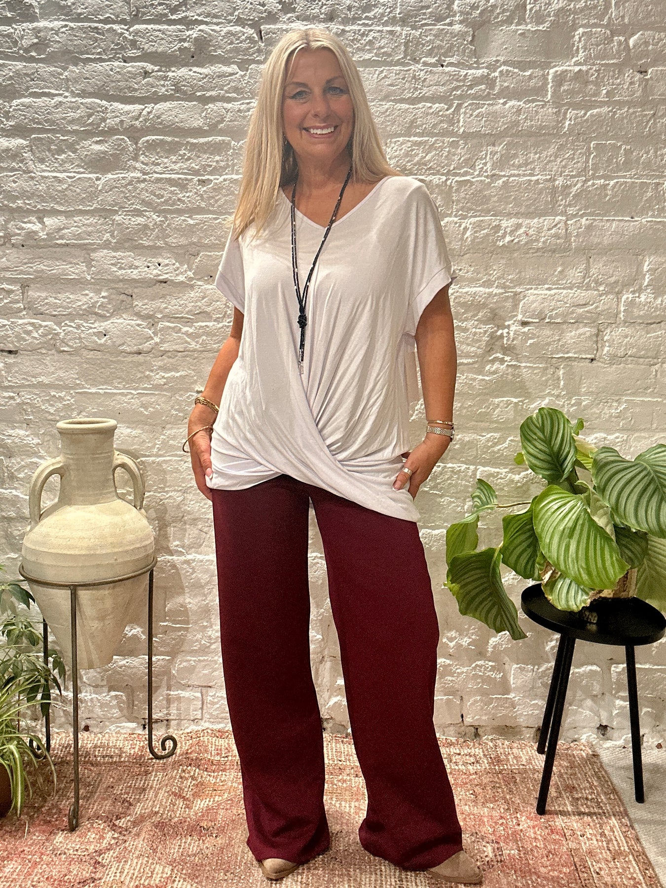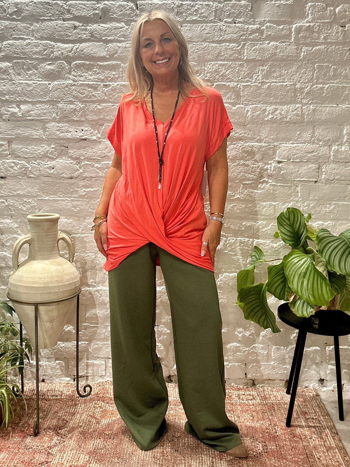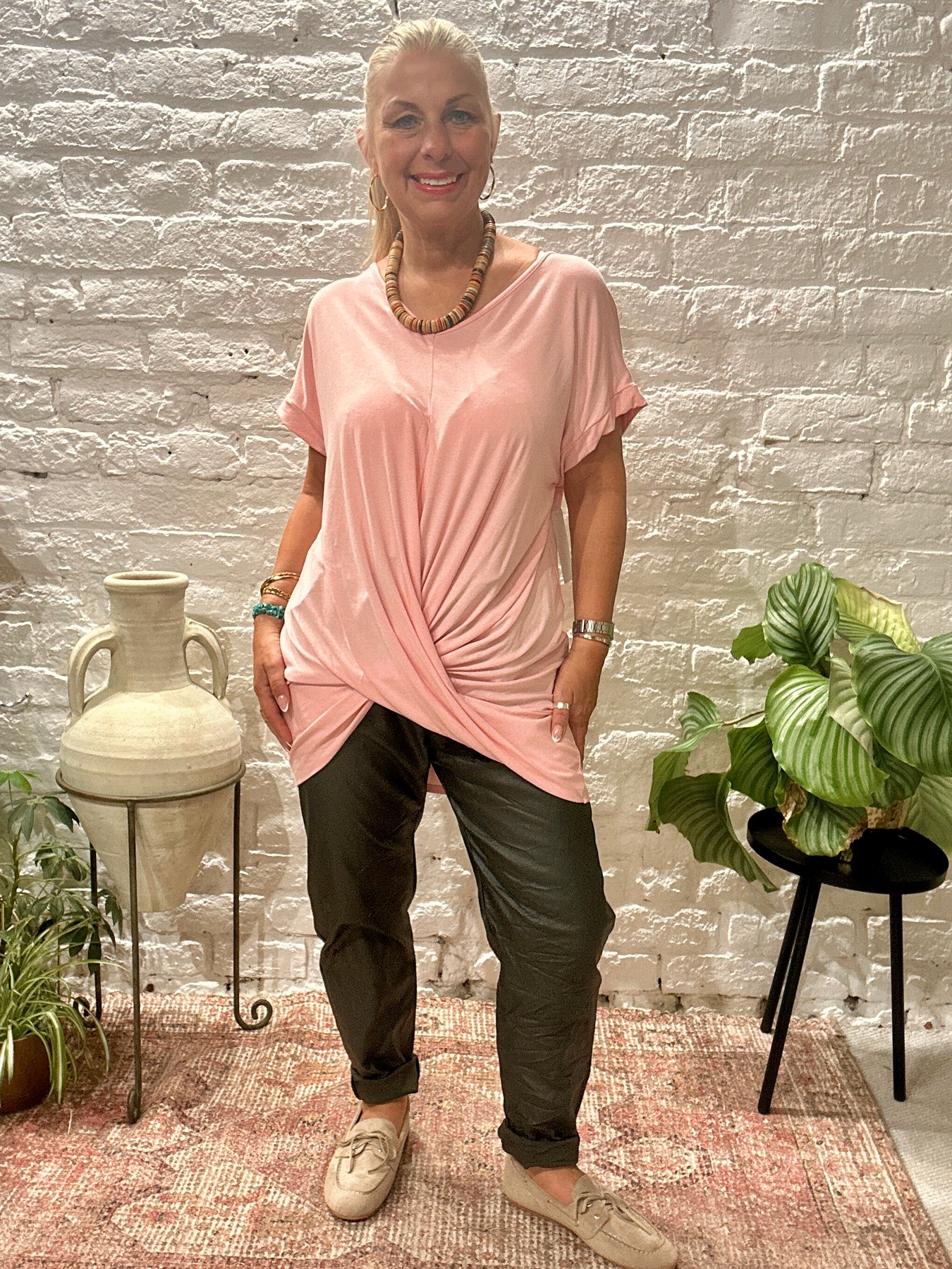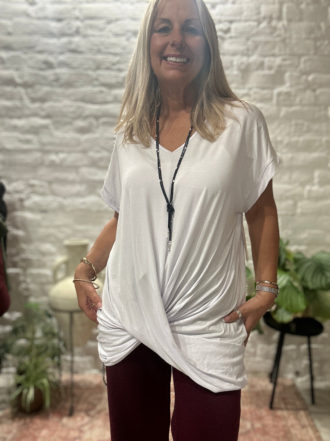 The Teresa Twist Bottom Basic cap Sleeve T shirt. Slight v front super soft feel. y made in Italy